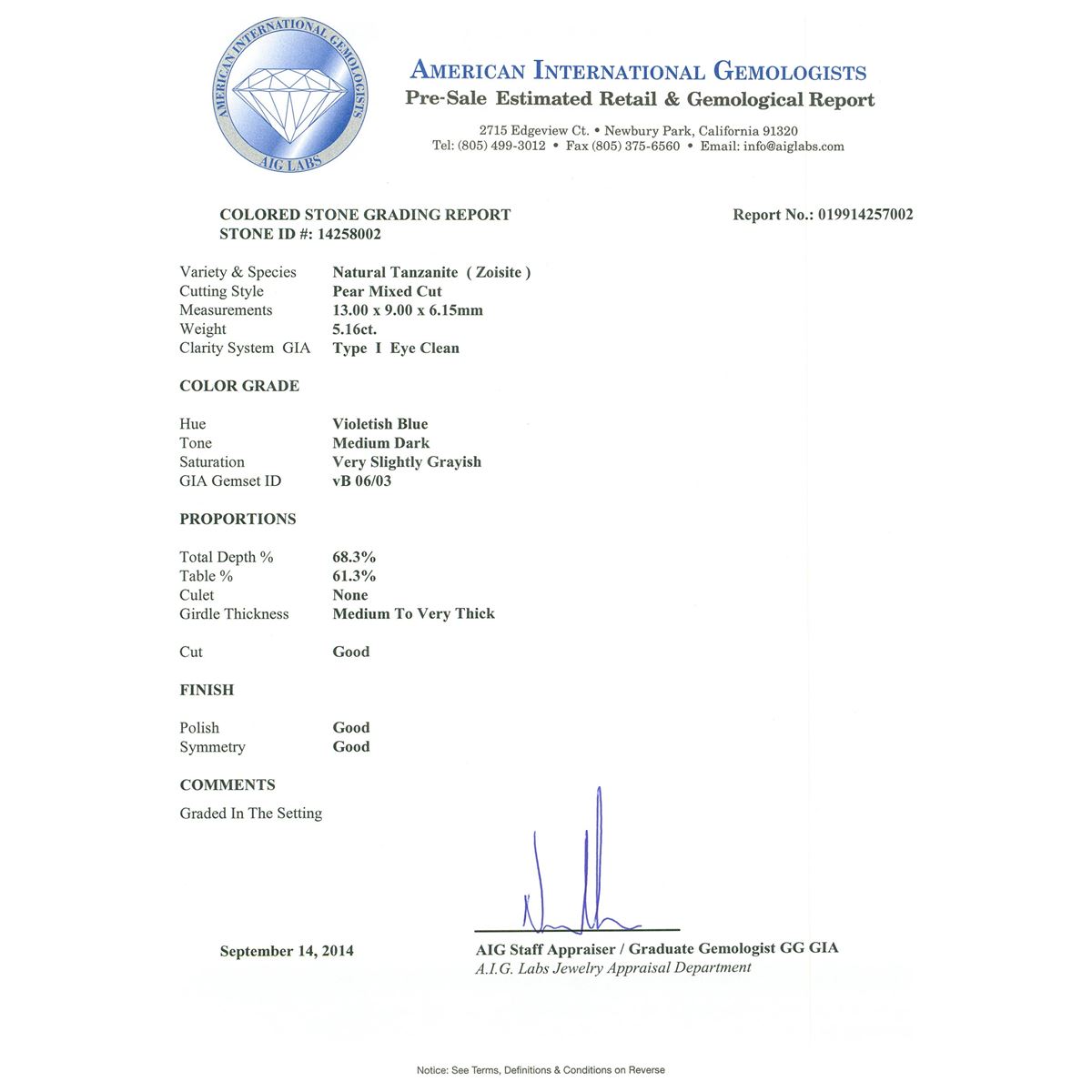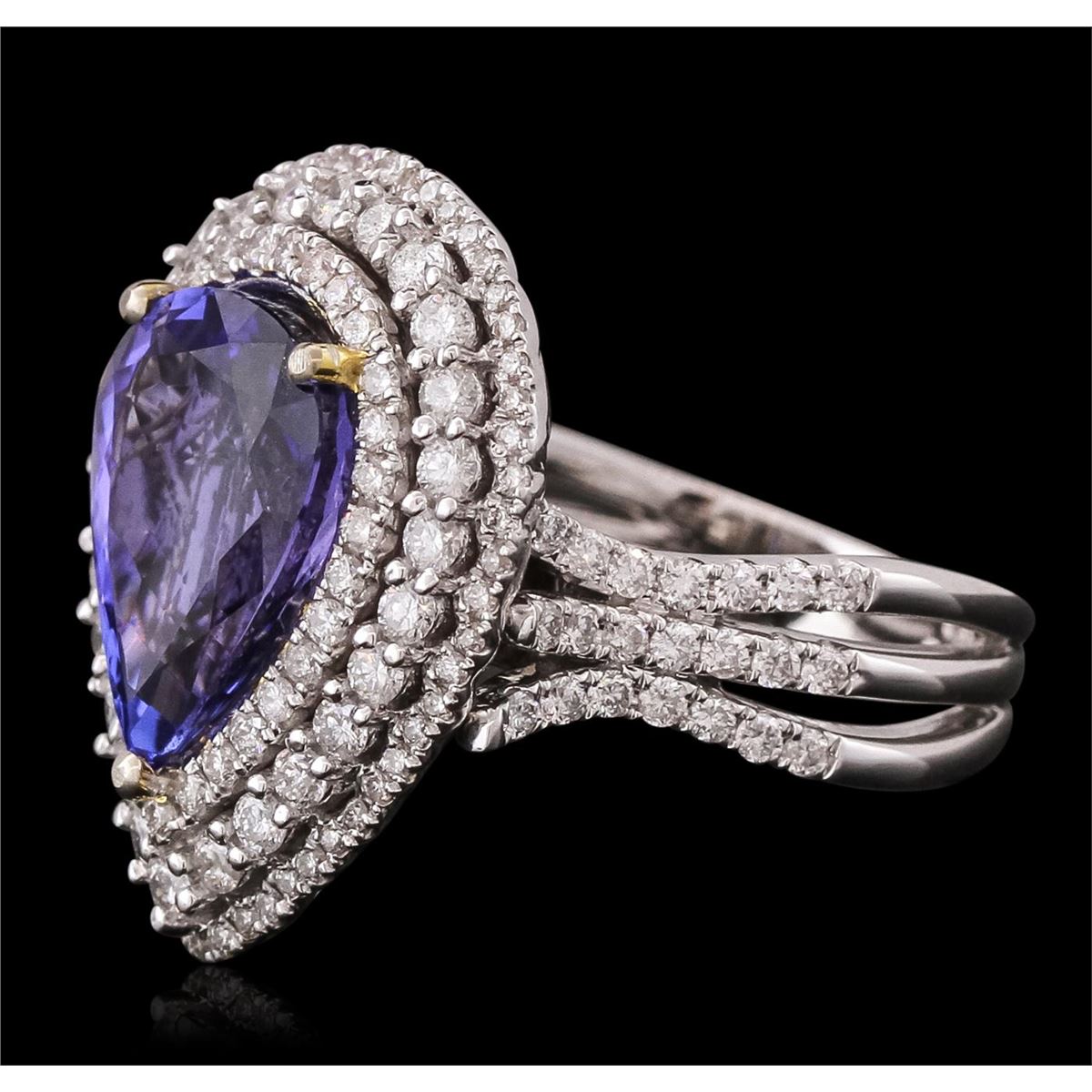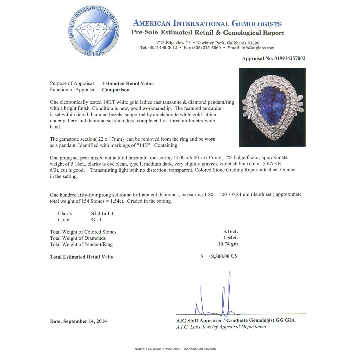 One electronically tested 14KT white gold ladies cast tanzanite & diamond pendant/ring with a bright finish. The featured tanzanite is set within tiered diamond bezels, supported by an elaborate white gold lattice under gallery and diamond set shoulders, completed by a three millimeter wide band. The gemstone section( 22 x 17mm) can be removed from the ring and be worn as a pendant. Identified with markings of "14K". Condition is new, good workmanship. Containing: One prong set pear mixed cut natural tanzanite, measuring 13.00 x 9.00 x 6.15mm, 7% bulge factor, approximate weight of 5.16ct., clarity is eye clean, type I, medium dark, very slightly grayish, violetish blue color, (GIA vB 6/3), cut is good. Transmitting light with no distortion, transparent. Colored Stone Grading Report attached. Graded in the setting. One Hundred Fifty-Four prong set round brilliant cut diamonds, measuring 1.80 - 1.00 x 0.84mm (depth est.) approximate total weight of 154 Stones = 1.54ct. Graded in the setting. Clarity: SI-2 to I-1. Color: G - I. Total Weight of Colored Stones 5.16ct. Total Weight of Diamonds 1.54ct. Total Weight of Pendant/Ring 10.74 grams. AIG Appraised at $18,300.00.