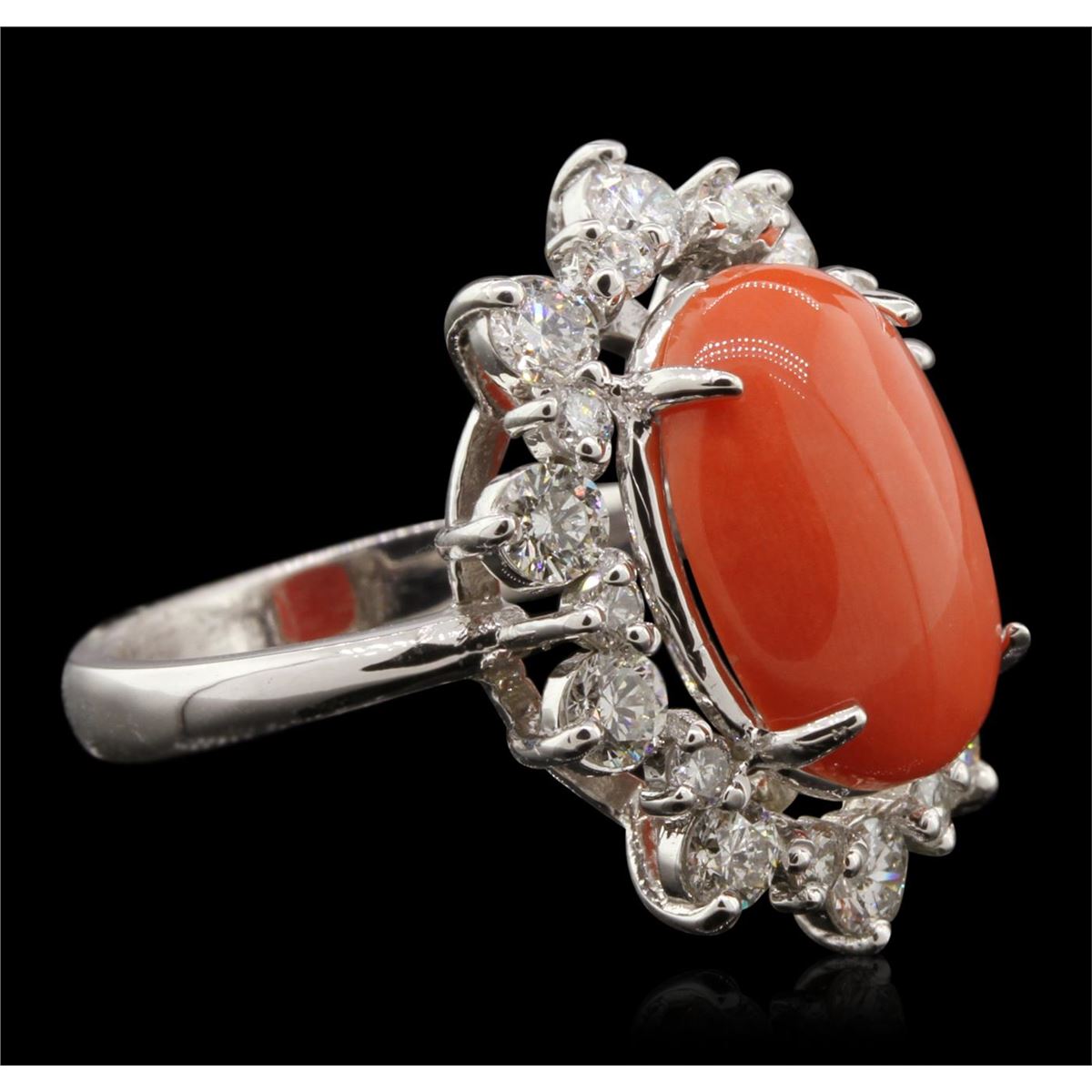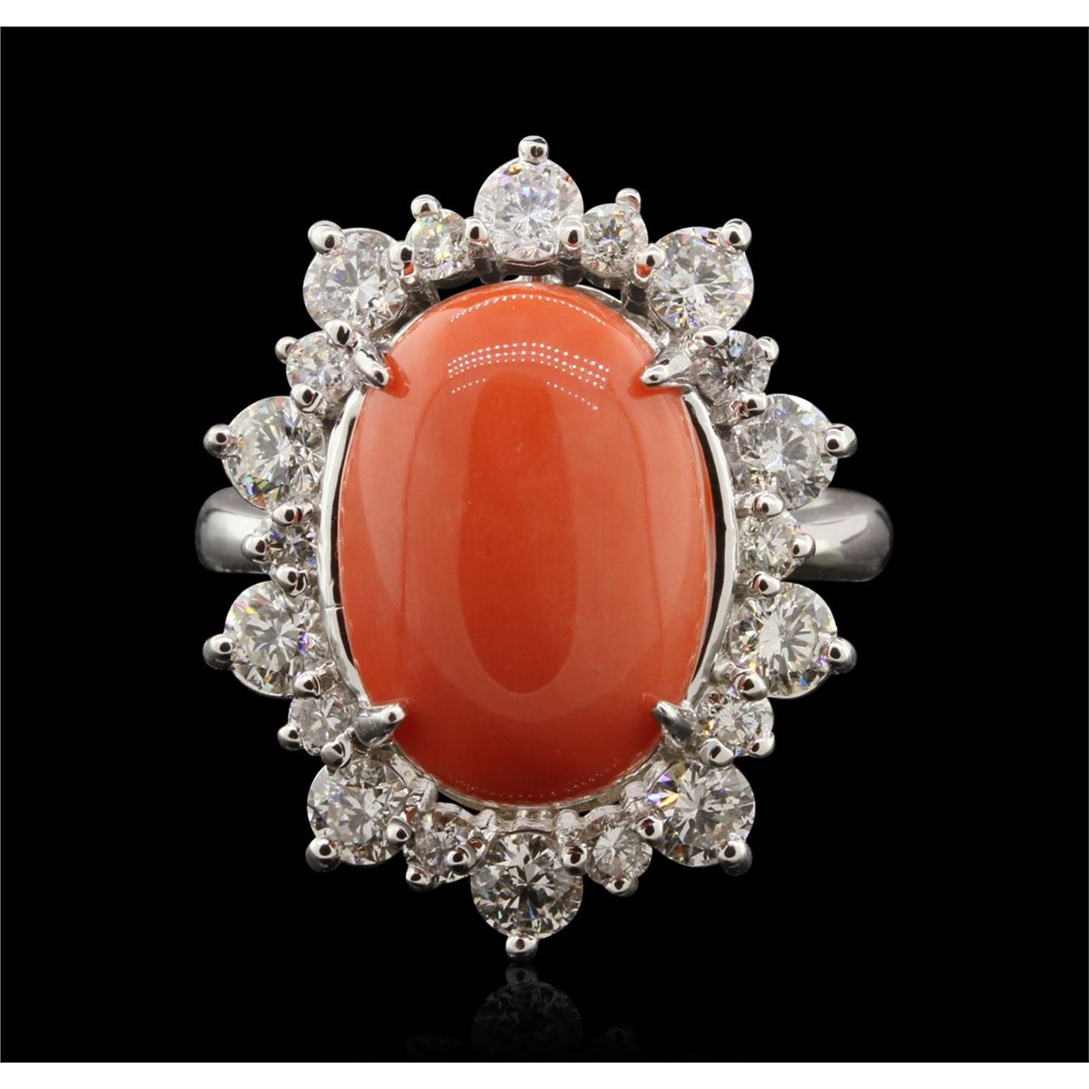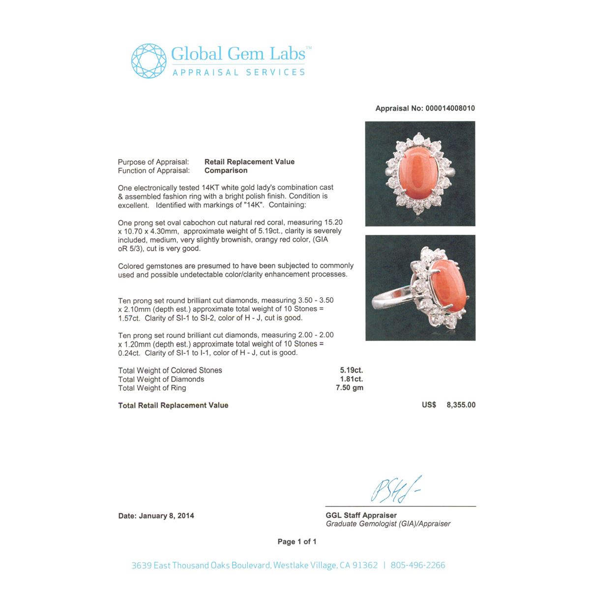 One electronically tested 14KT white gold Ladies combination cast & assembled fashion ring with a bright polish finish. Identified with markings of "14K". Condition is excellent. Containing: One prong set oval cabochon cut natural red coral, measuring 15.20 x 10.70 x 4.30mm, approximate weight of 5.19ct., clarity is severely included, medium, very slightly brownish, orangy red color, (GIA oR 5/3), cut is very good. Colored gemstones are presumed to have been subjected to commonly used and possible undetectable color/clarity enhancement processes. Ten prong set round brilliant cut diamonds, measuring 3.50 - 3.50 x 2.10mm (depth est.) approximate total weight of 10 Stones = 1.57ct. Clarity of SI-1 to SI-2, Color of H - J, Cut is Good. Ten prong set round brilliant cut diamonds, measuring 2.00 - 2.00 x 1.20mm (depth est.) approximate total weight of 10 Stones = 0.24ct. Clarity of SI-1 to I-1, Color of H - J, Cut is Good. Total Weight of Colored Stones 5.19ct. Total Weight of Diamonds 1.81ct. Total Weight of Ring 7.50gm. GGL Appraised at $8,355.00.