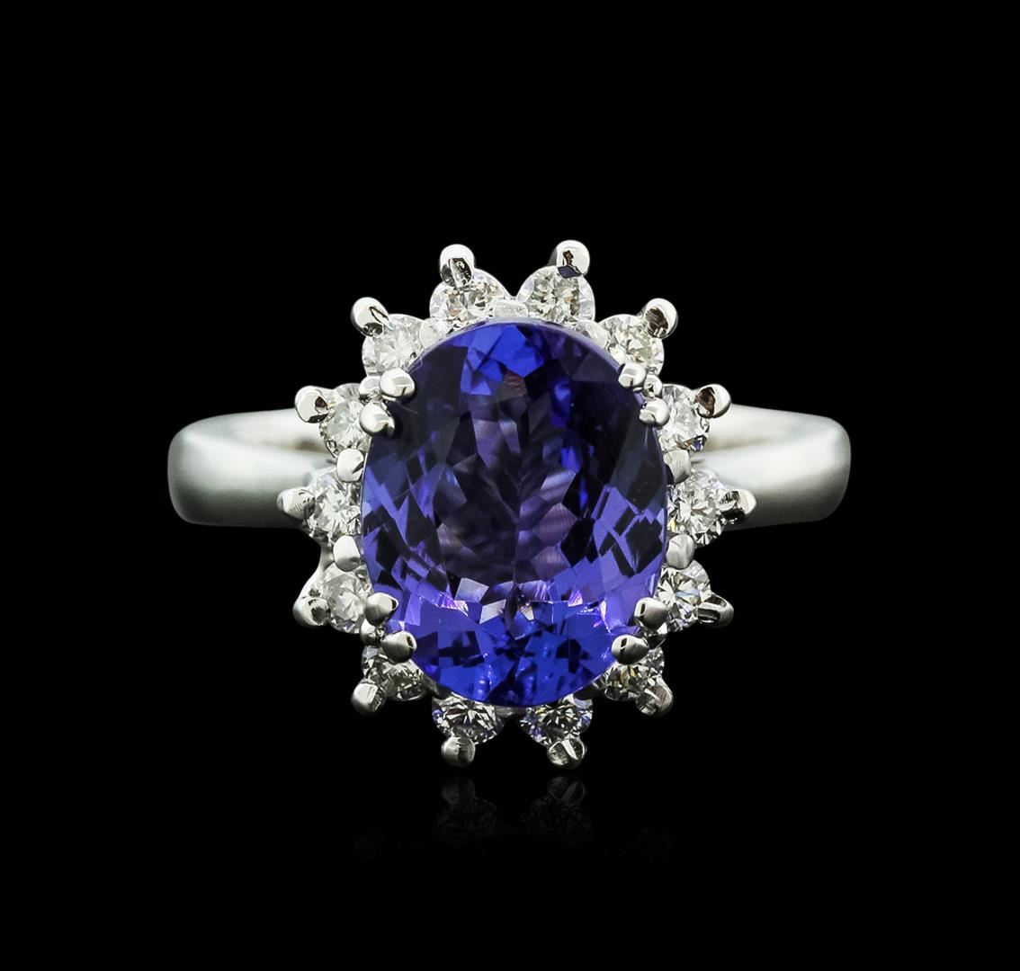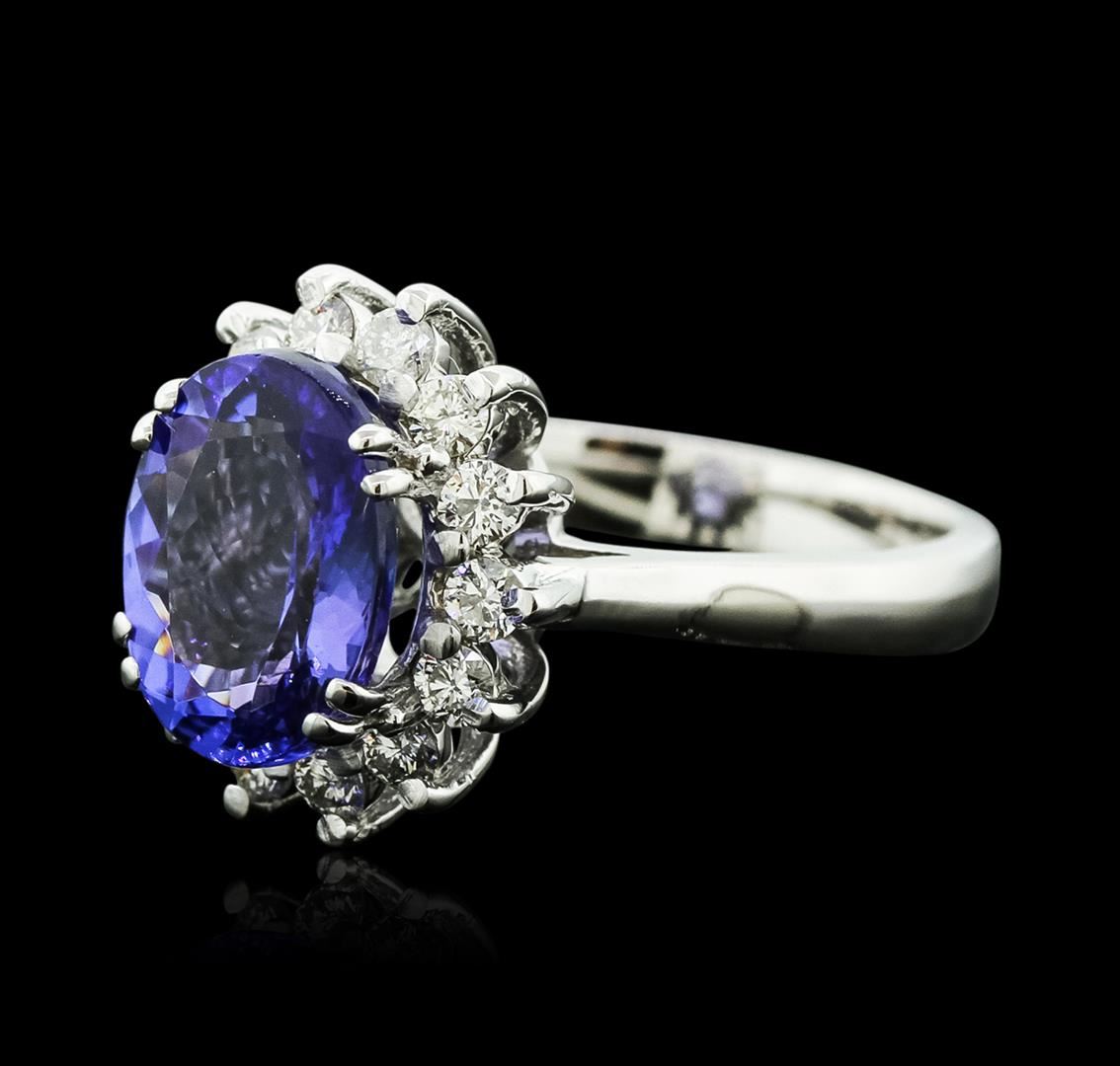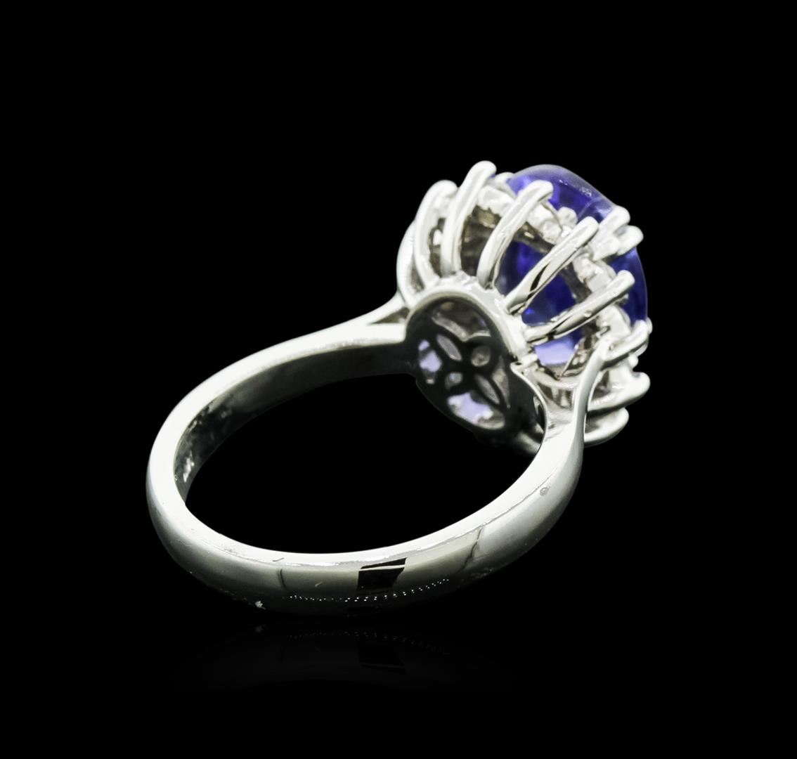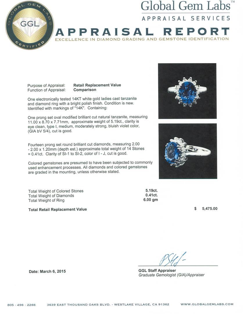 One electronically tested 14KT white gold ladies cast tanzanite and diamond ring with a bright polish finish. Identified with markings of "14K". Condition is new. Containing: One prong set oval modified brilliant cut natural tanzanite, measuring 11.00 x 8.70 x 7.71mm, approximate weight of 5.19ct., clarity is eye clean, type I, medium, moderately strong, bluish violet color, (GIA bV 5/4), cut is good. Fourteen prong set round brilliant cut diamonds, measuring 2.00 - 2.00 x 1.20mm (depth est.) approximate total weight of 14 Stones = 0.41ct.. Clarity: SI-1 to SI-2. Color: I - J, Cut is Good. Colored gemstones are presumed to have been subjected to commonly used enhancement processes. All diamonds and colored gemstones are graded in the mounting, unless otherwise stated.. Total Weight of Colored Stones 5.19ct.. Total Weight of Diamonds 0.41ct.. Total Weight of Ring 6.00 grams. GGL Appraised at $5,475.00.
