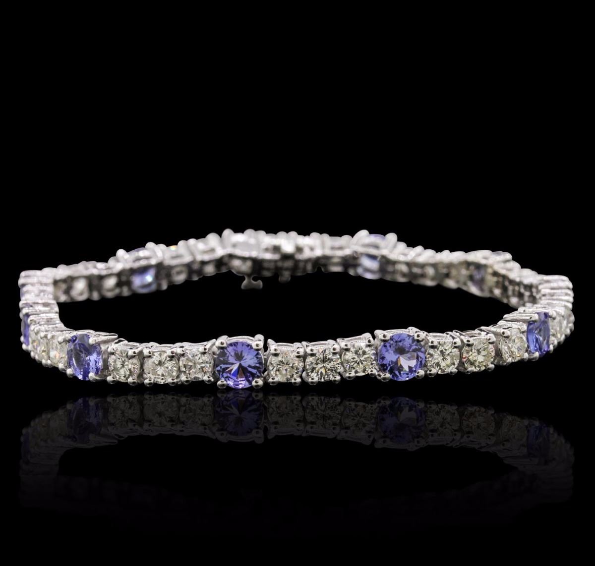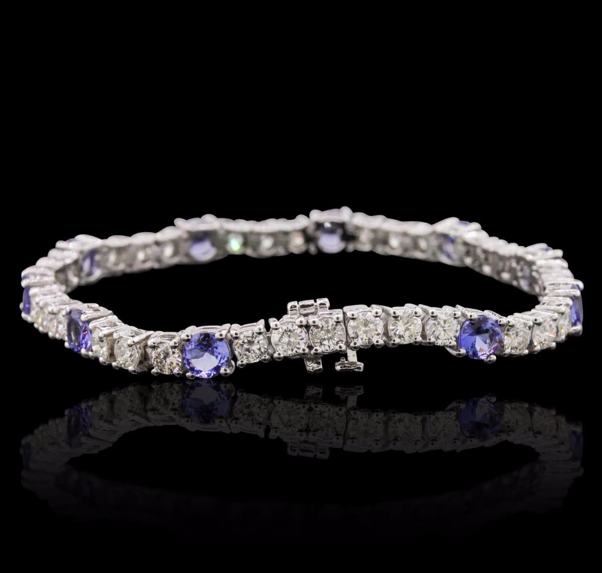 One electronically tested 14KT white gold ladies cast & assembled tanzanite and diamond bracelet with a bright polish finish. Condition is new, good workmanship. Seven and one-quarter inch length bracelet features a flexible tanzanite and diamond ribbon, terminating in a concealed clasp with safety bar. Identified with markings of "14K". Containing: Ten prong set round mixed cut natural tanzanites, measuring 5.10 - 5.00 x 2.80 mm, 6%. bulge factor, approximate. Total Weight of 5.20ct., clarity is eye clean, type I, medium dark, very slightly grayish, bluish violet color, (GIA bV 6/3), cut is good. Transmitting light with no distortion, transparent. Color grade is an average for the group. Graded in the setting. Tanzanite is a very rare gemstone that is only found in the country of Tanzania. Originally discovered in 1967. Tiffany & Company, named the stone Tanzanite. It is found in the Usumburu Mountains that border the Umba Valley of northern Tanzania. Tanzanite occurs in gray, brown, violet, blue, reddish-purple, & green. The gem is interesting because of its exceptional pleochroism. Rotated in different directions a tanzanite will exhibit multiple changes of color. Tanzanite has a low tolerance to ultrasonic cleaning, and should not be cleaned using this method. Thirty-Three prong set round brilliant cut diamonds, measuring 3.30 - 3.20 x 1.95mm (depth est.) approximate. Total Weight of 33 Stones = 4.00ct. Graded in the setting. Clarity: SI-2 to I-1. Color: H - J. Total Weight of Colored Stones 5.20ct. Total Weight of Diamonds 4.00ct. Total Weight of Bracelet 17.36 grams. AIG Appraised at $17,960.00.