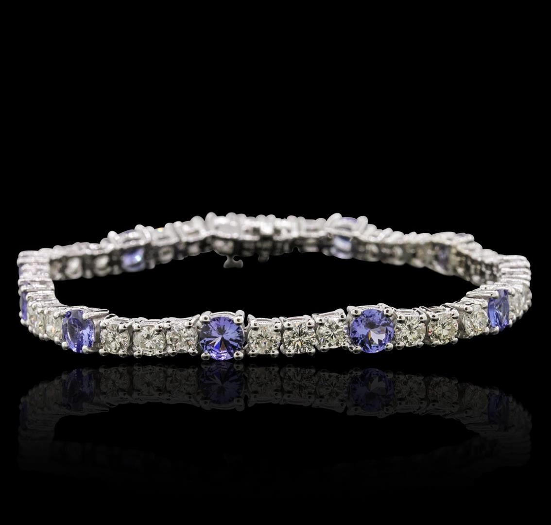 One electronically tested 14KT white gold ladies cast & assembled tanzanite and diamond bracelet with a bright polish finish. Condition is new, good workmanship. Seven and one-quarter inch length bracelet features a flexible tanzanite and diamond ribbon, terminating in a concealed clasp with safety bar. Identified with markings of "14K". Containing: Ten prong set round mixed cut natural tanzanites, measuring 5.10 - 5.00 x 2.80 mm, 6%. bulge factor, approximate. Total Weight of 5.20 ct., clarity is eye clean, type I, medium dark, very slightly grayish, bluish violet color, (GIA bV 6/3), cut is good. Transmitting light with no distortion, transparent. Color grade is an average for the group. Graded in the setting. Tanzanite is a very rare gemstone that is only found in the country of Tanzania. Originally discovered in 1967. Tiffany & Company, named the stone Tanzanite. It is found in the Usumburu Mountains that border the Umba Valley of northern Tanzania. Tanzanite occurs in gray, brown, violet, blue, reddish-purple, & green. The gem is interesting because of its exceptional pleochroism. Rotated in different directions a tanzanite will exhibit multiple changes of color. Tanzanite has a low tolerance to ultrasonic cleaning, and should not be cleaned using this method. Thirty-Three prong set round brilliant cut diamonds, measuring 3.30 - 3.20 x 1.95mm (depth est.) approximate. Total Weight of 33 Stones = 4.00 ct. Graded in the setting. Clarity: SI-2 to I-1. Color: H - J. Total Weight of Colored Stones 5.20 ct. Total Weight of Diamonds 4.00 ct. Total Weight of Bracelet 17.36 grams. AIG Appraised.