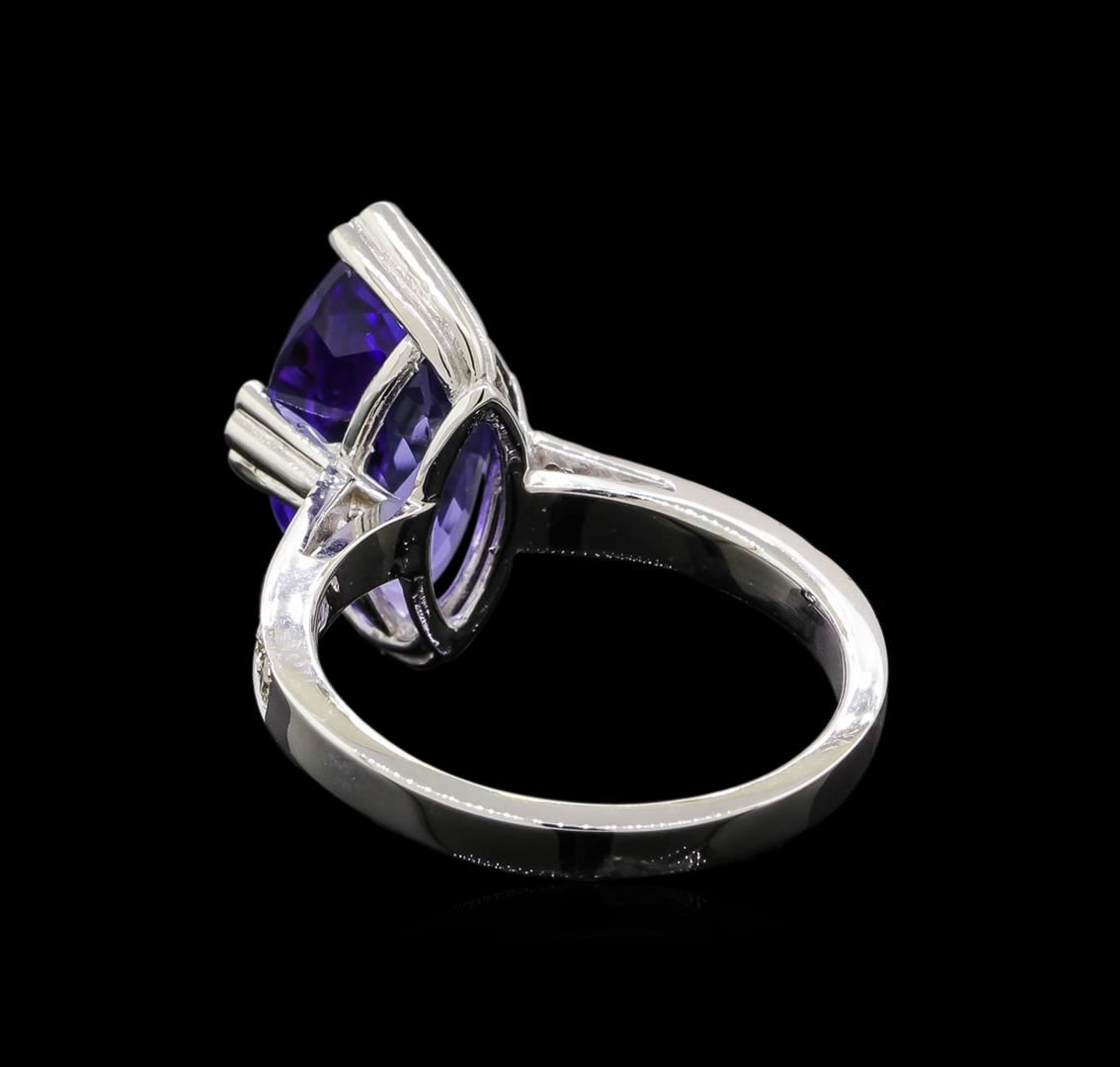 One electronically tested 14KT white gold ladies cast tanzanite and diamond ring. Identified with markings of "14K". Condition is new. Containing: One prong set marquise modified brilliant cut natural tanzanite, measuring 16.00 x 9.45 x 6.14mm, approximate weight of 5.20ct., clarity is eye clean, type I, medium light, very slightly grayish, violet color, (GIA V 4/3), cut is good. Twelve prong set round brilliant cut diamonds, measuring 1.70 - 1.70 x 1.02mm (depth est.) approximate total weight of 12 Stones = 0.30ct. Clarity: SI-2 to I-2. Color: I - J, Cut is Good. Colored gemstones are presumed to have been subjected to commonly used enhancement processes. All diamonds and colored gemstones are graded in the mounting, unless otherwise stated. Total Weight of Colored Stones 5.20ct. Total Weight of Diamonds 0.30ct. Total Weight of Ring 4.90 grams. GGL Appraised at $4,390.00.