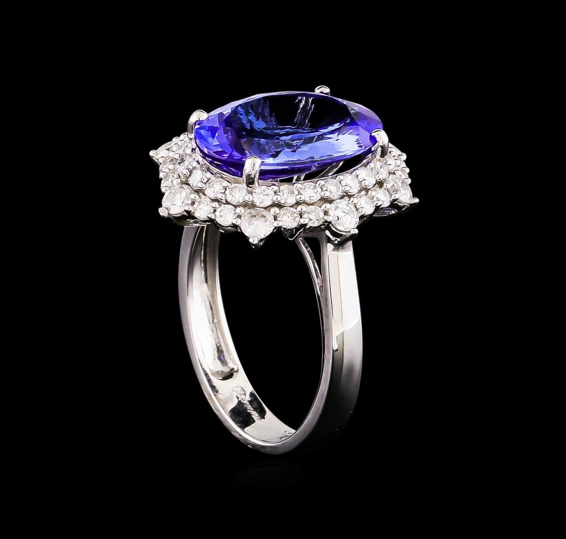 One electronically tested 14KT white gold Ladies combination cast & assembled ring with a bright polish finish. Condition is new. Identified with markings of "14K". Containing: One prong set oval modified brilliant cut natural tanzanite, measuring 14.40 x 9.70 x 5.35mm, approximate weight of 5.20 ct., clarity is eye clean, type I, medium light, very slightly grayish, bluish violet color, (GIA bV 4/3), cut is good. Colored gemstones are presumed to have been subjected to commonly used color/clarity enhancement processes. Eight prong set round brilliant cut diamonds, measuring 2.50 - 2.58 x 1.52mm (depth est.) approximate. Total Weight of 8 Stones = 0.48ct. Clarity: I-1. Color: I - J, Cut is Good. Forty prong set round brilliant cut diamonds, measuring 1.50 - 1.50 x 0.90mm (depth est.) approximate. Total Weight of 40 Stones = 0.49ct. Clarity: SI-2 to I-2. Color: I - J, Cut is Good. All grading of diamonds and colored gemstones in this piece of jewelry are graded in the mounting, unless otherwise stated. Total Weight of Colored Stones 5.20 ct. Total Weight of Diamonds 0.97ct. Total Weight of Ring 5.60 grams. GGL Appraised.