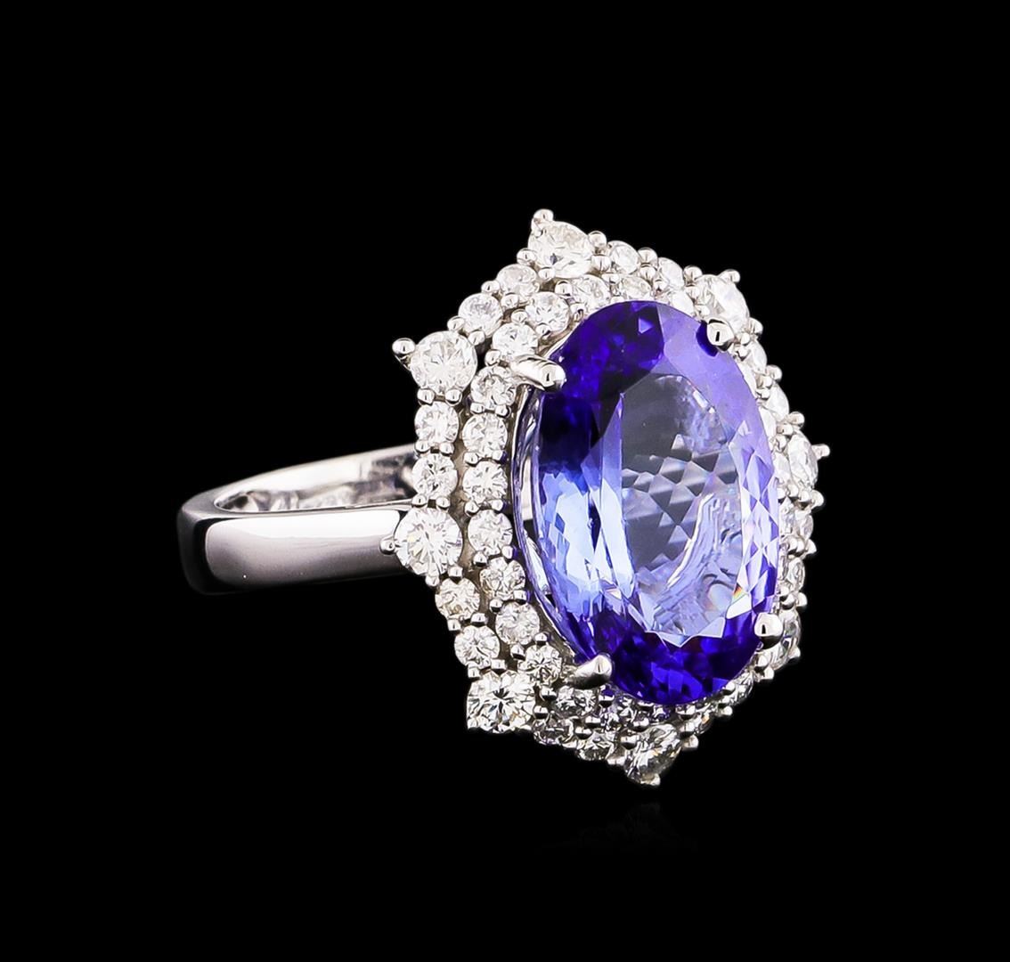One electronically tested 14KT white gold Ladies combination cast & assembled ring with a bright polish finish. Condition is new. Identified with markings of "14K". Containing: One prong set oval modified brilliant cut natural tanzanite, measuring 14.40 x 9.70 x 5.35mm, approximate weight of 5.20 ct., clarity is eye clean, type I, medium light, very slightly grayish, bluish violet color, (GIA bV 4/3), cut is good. Colored gemstones are presumed to have been subjected to commonly used color/clarity enhancement processes. Eight prong set round brilliant cut diamonds, measuring 2.50 - 2.58 x 1.52mm (depth est.) approximate. Total Weight of 8 Stones = 0.48ct. Clarity: I-1. Color: I - J, Cut is Good. Forty prong set round brilliant cut diamonds, measuring 1.50 - 1.50 x 0.90mm (depth est.) approximate. Total Weight of 40 Stones = 0.49ct. Clarity: SI-2 to I-2. Color: I - J, Cut is Good. All grading of diamonds and colored gemstones in this piece of jewelry are graded in the mounting, unless otherwise stated. Total Weight of Colored Stones 5.20 ct. Total Weight of Diamonds 0.97ct. Total Weight of Ring 5.60 grams. GGL Appraised.