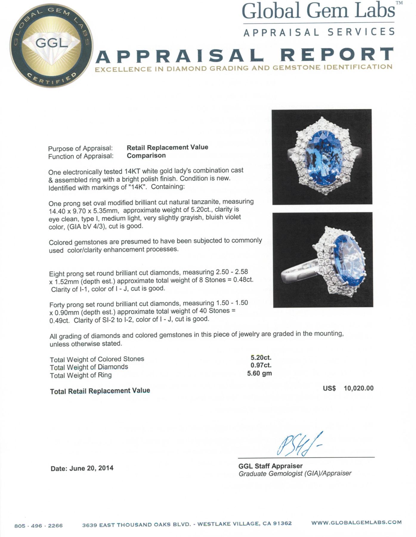 One electronically tested 14KT white gold Ladies combination cast & assembled ring with a bright polish finish. Condition is new. Identified with markings of "14K". Containing: One prong set oval modified brilliant cut natural tanzanite, measuring 14.40 x 9.70 x 5.35mm, approximate weight of 5.20 ct., clarity is eye clean, type I, medium light, very slightly grayish, bluish violet color, (GIA bV 4/3), cut is good. Colored gemstones are presumed to have been subjected to commonly used color/clarity enhancement processes. Eight prong set round brilliant cut diamonds, measuring 2.50 - 2.58 x 1.52mm (depth est.) approximate. Total Weight of 8 Stones = 0.48ct. Clarity: I-1. Color: I - J, Cut is Good. Forty prong set round brilliant cut diamonds, measuring 1.50 - 1.50 x 0.90mm (depth est.) approximate. Total Weight of 40 Stones = 0.49ct. Clarity: SI-2 to I-2. Color: I - J, Cut is Good. All grading of diamonds and colored gemstones in this piece of jewelry are graded in the mounting, unless otherwise stated. Total Weight of Colored Stones 5.20 ct. Total Weight of Diamonds 0.97ct. Total Weight of Ring 5.60 grams. GGL Appraised.