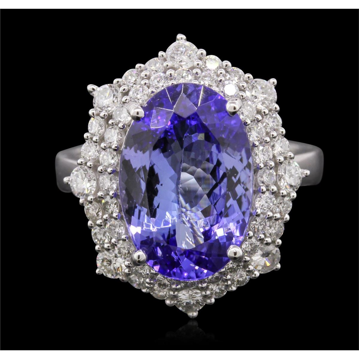 One electronically tested 14KT white gold Ladies combination cast & assembled ring with a bright polish finish. Condition is new. Identified with markings of "14K". Containing: One prong set oval modified brilliant cut natural tanzanite, measuring 14.40 x 9.70 x 5.35mm, approximate weight of 5.20ct., clarity is eye clean, type I, medium light, very slightly grayish, bluish violet color, (GIA bV 4/3), cut is good. Colored gemstones are presumed to have been subjected to commonly used color/clarity enhancement processes. Eight prong set round brilliant cut diamonds, measuring 2.50 - 2.58 x 1.52mm (depth est.) approximate. Total Weight of 8 Stones = 0.48ct. Clarity: I-1. Color: I - J, Cut is Good. Forty prong set round brilliant cut diamonds, measuring 1.50 - 1.50 x 0.90mm (depth est.) approximate. Total Weight of 40 Stones = 0.49ct. Clarity: SI-2 to I-2. Color: I - J, Cut is Good. All grading of diamonds and colored gemstones in this piece of jewelry are graded in the mounting, unless otherwise stated. Total Weight of Colored Stones 5.20ct. Total Weight of Diamonds 0.97ct. Total Weight of Ring 5.60 grams. GGL Appraised at $10,020.00.