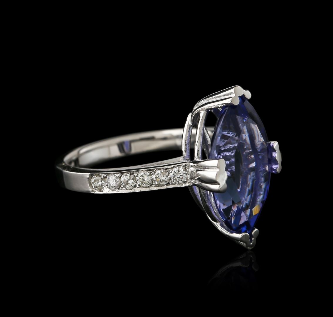 One electronically tested 14KT white gold ladies cast tanzanite and diamond ring. Identified with markings of "14K". Condition is new. Containing: One prong set marquise modified brilliant cut natural tanzanite, measuring 16.00 x 9.45 x 6.14mm, approximate weight of 5.20ct., clarity is eye clean, type I, medium light, very slightly grayish, violet color, (GIA V 4/3), cut is good. Twelve prong set round brilliant cut diamonds, measuring 1.70 - 1.70 x 1.02mm (depth est.) approximate total weight of 12 Stones = 0.30ct. Clarity: SI-2 to I-2. Color: I - J, Cut is Good. Colored gemstones are presumed to have been subjected to commonly used enhancement processes. All diamonds and colored gemstones are graded in the mounting, unless otherwise stated. Total Weight of Colored Stones 5.20ct. Total Weight of Diamonds 0.30ct. Total Weight of Ring 4.90 grams. GGL Appraised at $4,390.00.