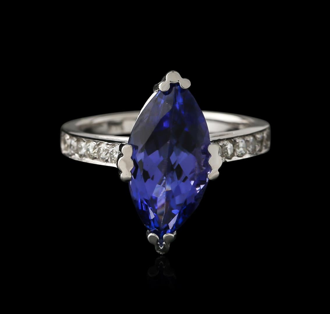 One electronically tested 14KT white gold ladies cast tanzanite and diamond ring. Identified with markings of "14K". Condition is new. Containing: One prong set marquise modified brilliant cut natural tanzanite, measuring 16.00 x 9.45 x 6.14mm, approximate weight of 5.20ct., clarity is eye clean, type I, medium light, very slightly grayish, violet color, (GIA V 4/3), cut is good. Twelve prong set round brilliant cut diamonds, measuring 1.70 - 1.70 x 1.02mm (depth est.) approximate total weight of 12 Stones = 0.30ct. Clarity: SI-2 to I-2. Color: I - J, Cut is Good. Colored gemstones are presumed to have been subjected to commonly used enhancement processes. All diamonds and colored gemstones are graded in the mounting, unless otherwise stated. Total Weight of Colored Stones 5.20ct. Total Weight of Diamonds 0.30ct. Total Weight of Ring 4.90 grams. GGL Appraised at $4,390.00.