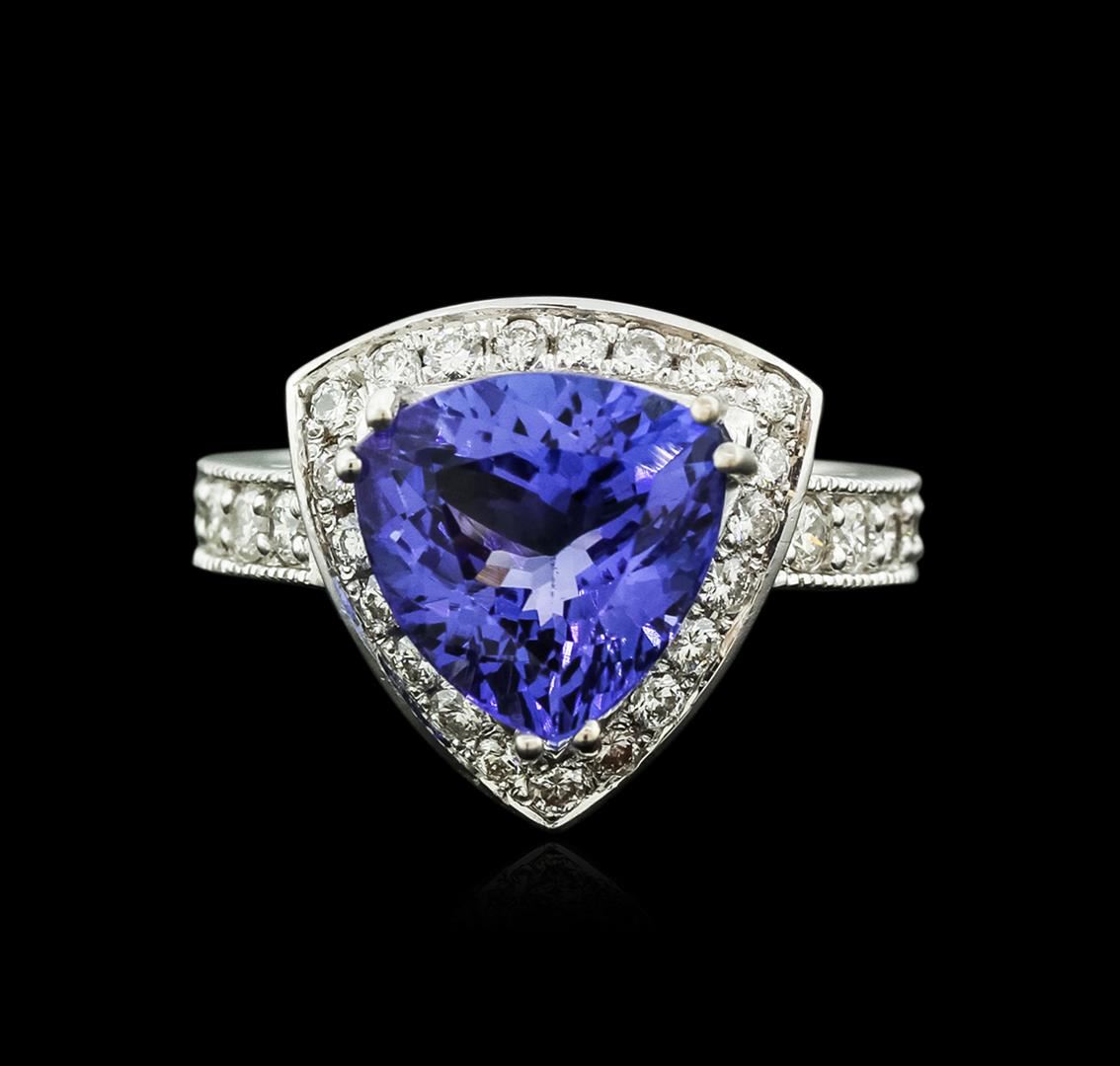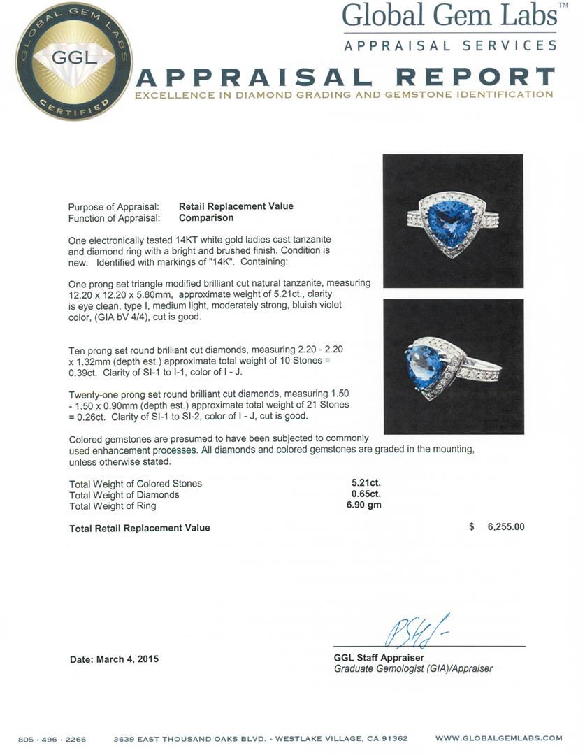 One electronically tested 14KT white gold ladies cast tanzanite and diamond ring with a bright and brushed finish. Identified with markings of "14K". Condition is new. Containing: One prong set triangle modified brilliant cut natural tanzanite, measuring 12.20 x 12.20 x 5.80mm, approximate weight of 5.21ct., clarity is eye clean, type I, medium light, moderately strong, bluish violet color, (GIA bV 4/4), cut is good. Ten prong set round brilliant cut diamonds, measuring 2.20 - 2.20 x 1.32mm (depth est.) approximate total weight of 10 Stones = 0.39ct. Clarity: SI-1 to I-1. Color: I - J. Twenty-One prong set round brilliant cut diamonds, measuring 1.50 - 1.50 x 0.90mm (depth est.) approximate total weight of 21 Stones = 0.26ct. Clarity: SI-1 to SI-2. Color: I - J, Cut is Good. Colored gemstones are presumed to have been subjected to commonly used enhancement processes. All diamonds and colored gemstones are graded in the mounting, unless otherwise stated. Total Weight of Colored Stones 5.21ct. Total Weight of Diamonds 0.65ct. Total Weight of Ring 6.90 grams. GGL Appraised at $6,255.00.