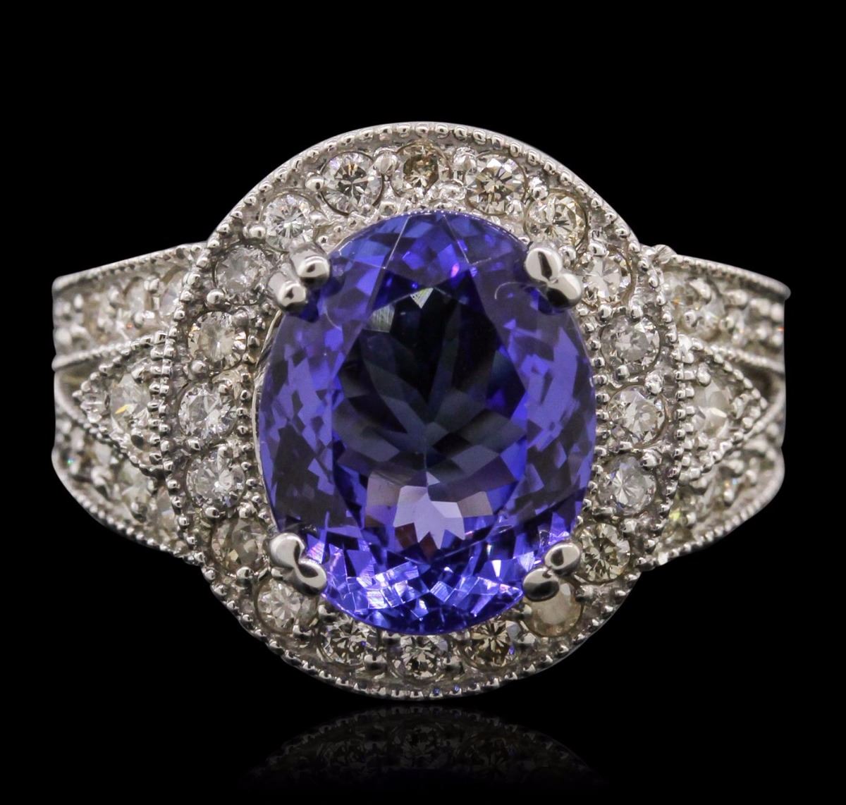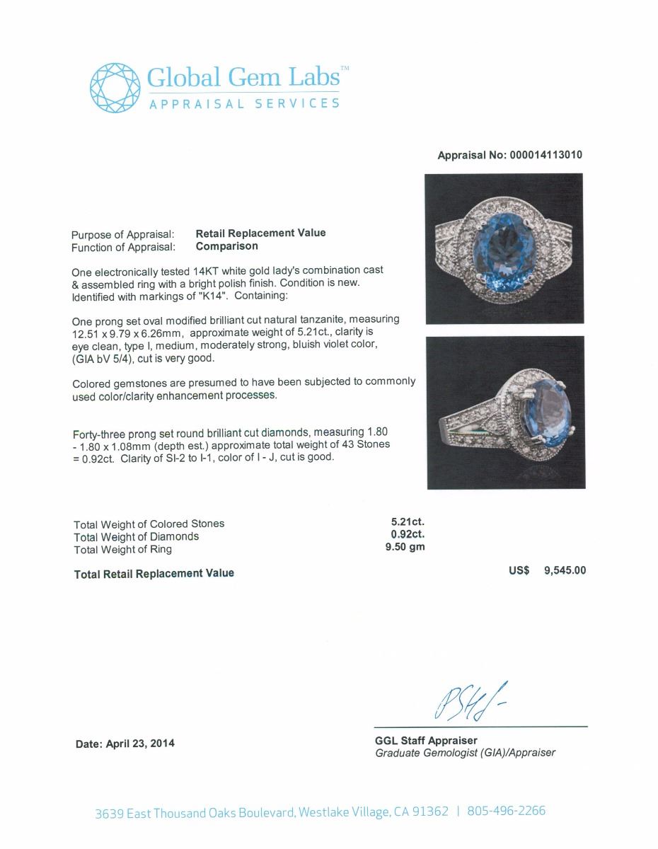 One electronically tested 14KT white gold Ladies combination cast & assembled ring with a bright polish finish. Condition is new. Identified with markings of "K14". Containing: One prong set oval modified brilliant cut natural tanzanite, measuring 12.51 x 9.79 x 6.26mm, approximate weight of 5.21ct., clarity is eye clean, type I, medium, moderately strong, bluish violet color, (GIA bV 5/4), cut is very good. Colored gemstones are presumed to have been subjected to commonly used color/clarity enhancement processes. Forty-Three prong set round brilliant cut diamonds, measuring 1.80 - 1.80 x 1.08mm (depth est.) approximate. Total Weight of 43 Stones = 0.92ct. Clarity: SI-2 to I-1. Color: I - J, Cut is Good. Total Weight of Colored Stones 5.21ct. Total Weight of Diamonds 0.92ct. Total Weight of Ring 9.50 grams. GGL Appraised at $9,545.00.