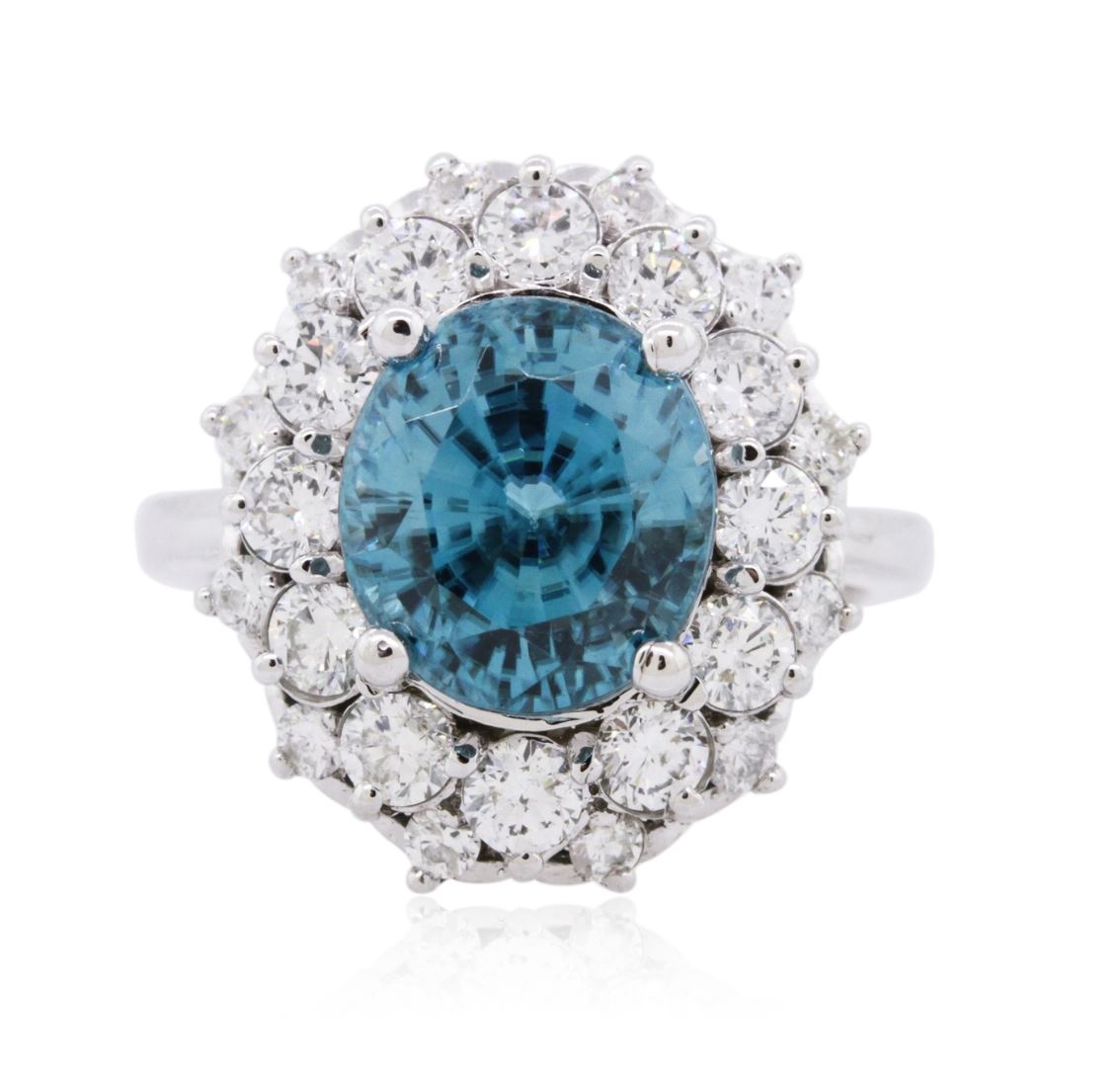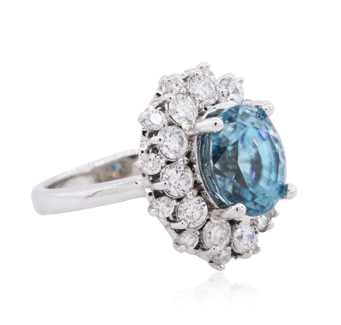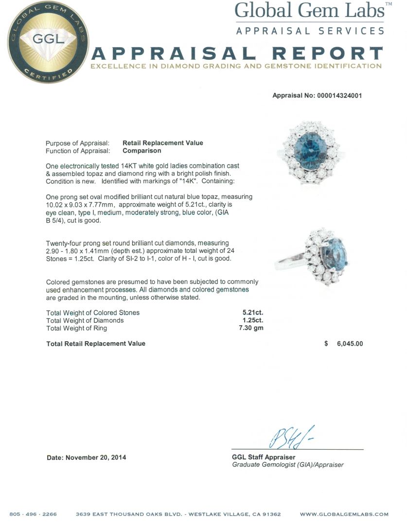 One electronically tested 14KT white gold ladies combination cast & assembled topaz and diamond ring with a bright polish finish. Identified with markings of "14K". Condition is new. Containing: One prong set oval modified brilliant cut natural blue topaz, measuring 10.02 x 9.03 x 7.77mm, approximate weight of 5.21ct., clarity is eye clean, type I, medium, moderately strong, blue color, (GIA B 5/4), cut is good. Twenty-Four prong set round brilliant cut diamonds, measuring 2.90 - 1.80 x 1.41mm (depth est.) approximate total weight of 24 Stones = 1.25ct. Clarity: SI-2 to I-1. Color: H - I, Cut is Good. Colored gemstones are presumed to have been subjected to commonly used enhancement processes. All diamonds and colored gemstones are graded in the mounting, unless otherwise stated. Total Weight of Colored Stones 5.21ct. Total Weight of Diamonds 1.25ct. Total Weight of Ring 7.30 grams. GGL Appraised at $6,045.00.