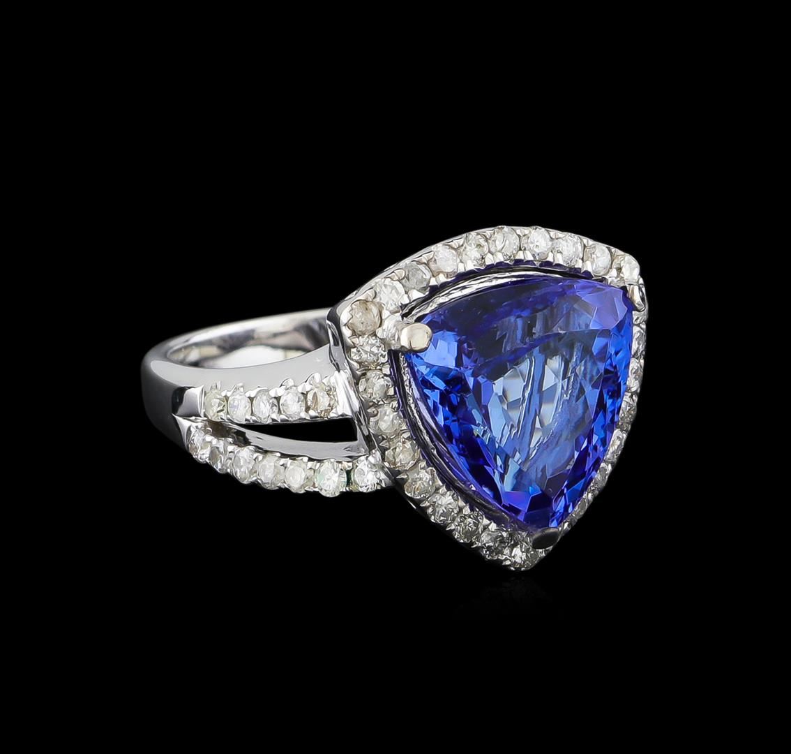 One electronically tested 14KT white gold ladies cast tanzanite and diamond ring with a bright polish finish. Identified with markings of "14K". Condition is new. Containing: One prong set triangle modified brilliant cut natural tanzanite, measuring 11.00 x 11.00 x 7.15mm, approximate weight of 5.22ct., clarity is eye clean, type I, medium light, very slightly grayish, violet color, (GIA V 4/3), cut is good. Fifty prong set round brilliant cut diamonds, measuring 1.30 - 1.30 x 0.78mm (depth est.) approximate total weight of 50 Stones = 0.40ct. Clarity: I-1 to I-2. Color: H - I. Colored gemstones are presumed to have been subjected to commonly used enhancement processes. All diamonds and colored gemstones are graded in the mounting, unless otherwise stated. Total Weight of Colored Stones 5.22ct. Total Weight of Diamonds 0.40ct. Total Weight of Ring 9.10 grams. GGL Appraised at $5,840.00.