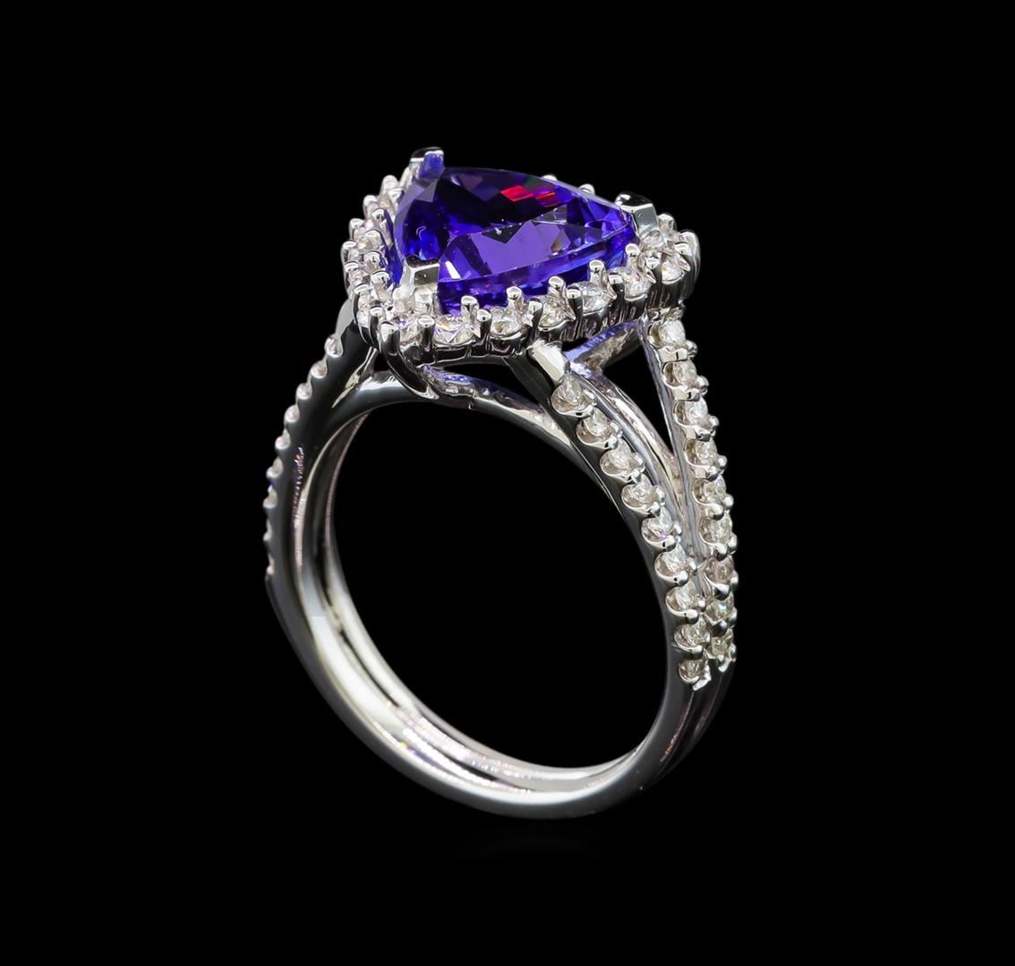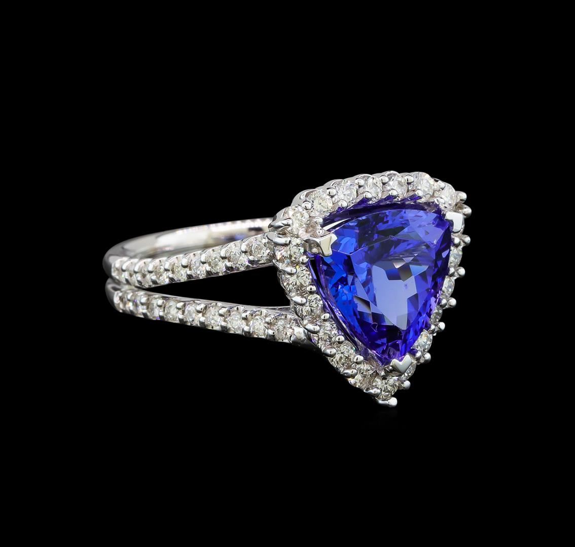 One electronically tested 14KT white gold ladies cast tanzanite and diamond ring with a bright polish finish. Identified with markings of "14K". Condition is new. Containing: One prong set triangle modified mixed cut natural tanzanite, measuring 11.00 x 11.00 x 7.16mm, approximate weight of 5.22ct., clarity is eye clean, type I, medium, moderately strong, bluish violet color, (GIA bV 5/4), cut is good. Fifty-Five prong set round brilliant cut diamonds, measuring 1.80 - 1.30 x 0.93mm (depth est.) approximate total weight of 55 Stones = 0.75ct. Clarity: SI-1 to I-1. Color: I - J, Cut is Good. Colored gemstones are presumed to have been subjected to commonly used enhancement processes. All diamonds and colored gemstones are graded in the mounting, unless otherwise stated. Total Weight of Colored Stones 5.22ct. Total Weight of Diamonds 0.75ct. Total Weight of Ring 6.10 grams. GGL Appraised at $5,995.00.