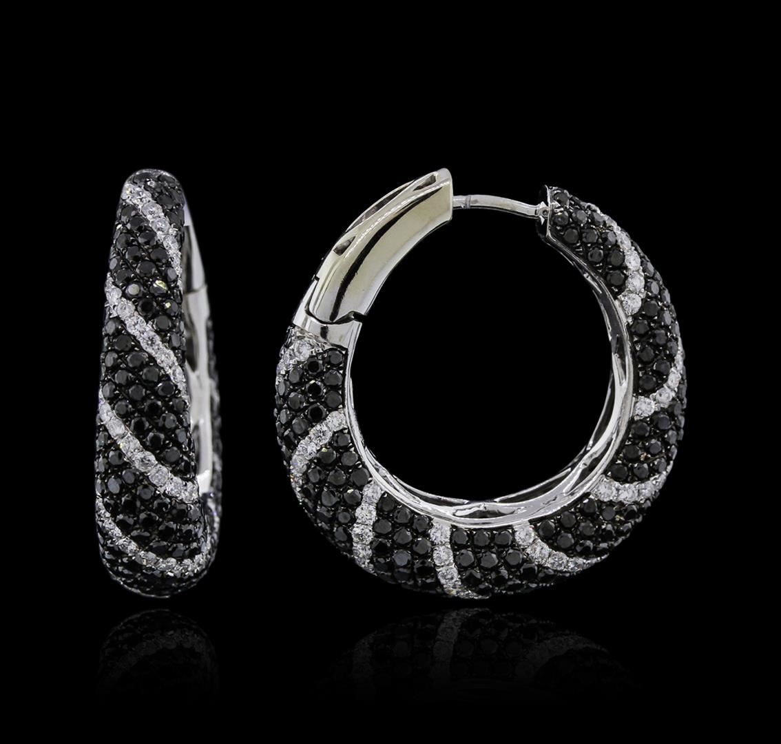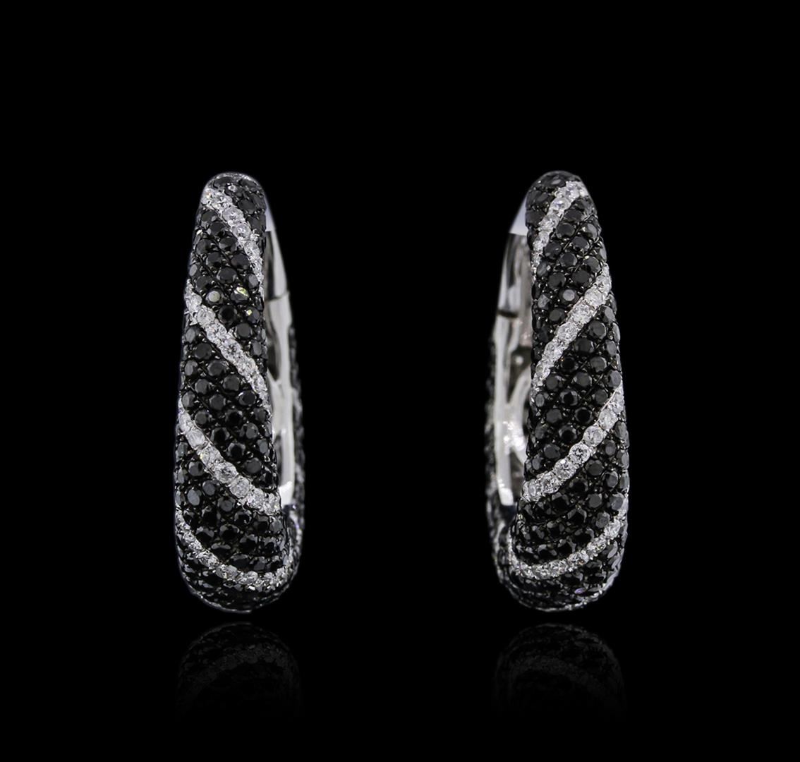 One pair electronically tested 14KT white gold ladies cast diamond hoop earrings with hinged clip backs with a bright polish finish. Identified with markings of "14K". Condition is new. Containing: One Hundred Seventy-Four prong set round brilliant cut diamonds, measuring 1.20 - 1.20 x 0.72mm (depth est.) approximate total weight of 174 Stones = 1.10ct. Clarity: SI-2 to I-1. Color: G - H, Cut is Good. Five Hundred Sixteen prong set round brilliant cut diamonds, measuring 1.30 - 1.30 x 0.78mm (depth est.) approximate total weight of 516 Stones = 4.13ct. color of Fancy Black, Cut is Good. All diamonds are graded in the mounting, unless otherwise stated. Total Weight of Diamonds 5.22ct. Total Weight of Hoop Earrings 11.70 grams. GGL Appraised at $7,845.00.