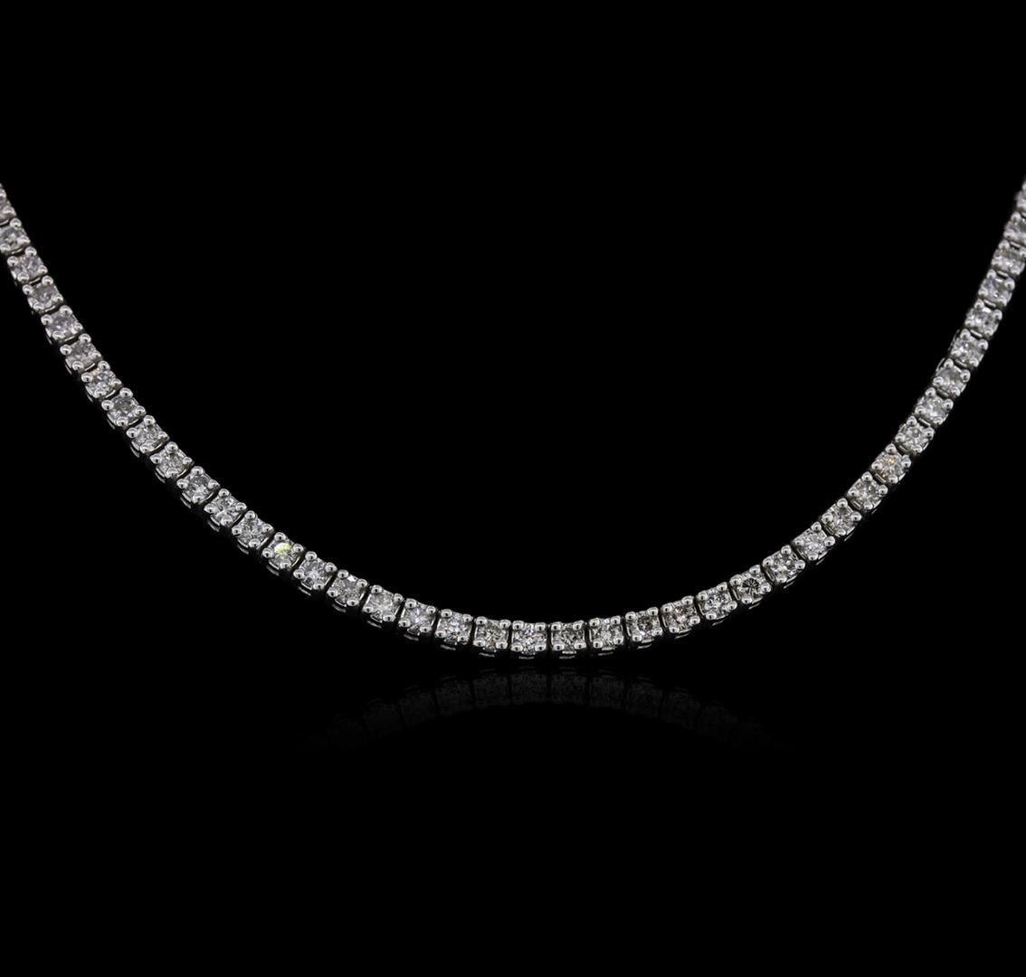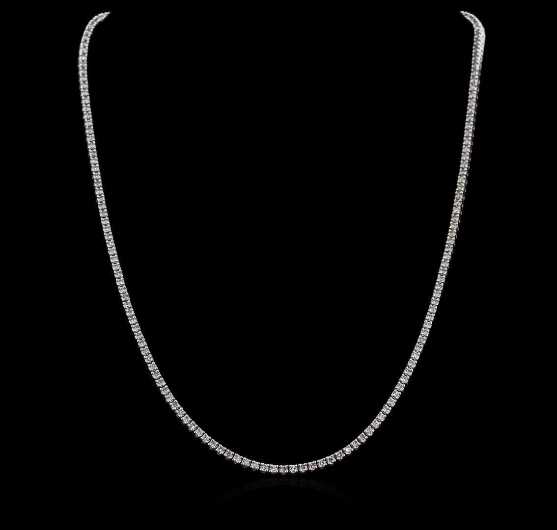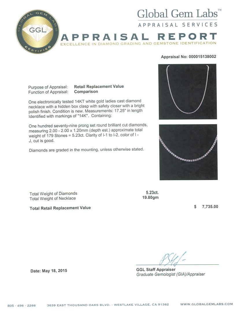 One electronically tested 14KT white gold ladies cast diamond necklace with a hidden box clasp with safety closer with a bright polish finish. Measurements: 17.25" in length Identified with markings of "14K". Condition is new. Containing: One Hundred Seventy-Nine prong set round brilliant cut diamonds, measuring 2.00 - 2.00 x 1.20mm (depth est.) approximate total weight of 179 Stones = 5.23ct. Clarity: I-1 to I-2. Color: I - J, Cut is Good. Diamonds are graded in the mounting, unless otherwise stated. Total Weight of Diamonds 5.23ct. Total Weight of Necklace 19.80 grams. GGL Appraised at $7,735.00.