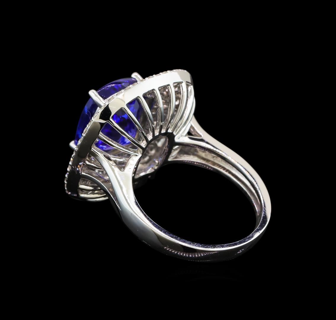 One electronically tested 14KT white gold ladies cast tanzanite and diamond ring with a bright polish finish. Identified with markings of "K14". Condition is new. Containing: One prong set rectangular cushion modified brilliant cut natural tanzanite, measuring 10.90 x 8.80 x 7.00mm, approximate weight of 5.29ct., clarity is eye clean, type I, medium, moderately strong, bluish violet color, (GIA bV 5/4), cut is good. Ninety-Four prong set round brilliant cut diamonds, measuring 1.30 - 1.30 x 0.78mm (depth est.) approximate total weight of 94 Stones = 0.75ct. Clarity: SI-1 to I-1. Color: H - I, Cut is Good. Colored gemstones are presumed to have been subjected to commonly used enhancement processes. All diamonds and colored gemstones are graded in the mounting, unless otherwise stated. Total Weight of Colored Stones 5.29ct. Total Weight of Diamonds 0.75ct. Total Weight of Ring 7.50 grams. GGL Appraised at $5,440.00.