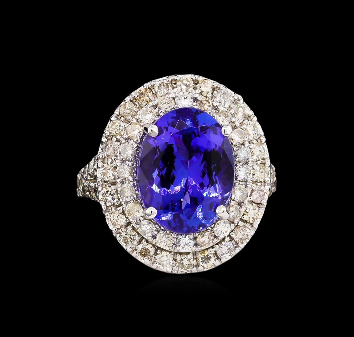 One electronically tested 14KT white gold Ladies combination cast & assembled ring with a bright polish finish. Condition is new. Identified with markings of "K14". Containing: One prong set oval modified brilliant cut natural tanzanite, measuring 12.41 x 9.64 x 6.50mm, approximate weight of 5.29ct., clarity is eye clean, type I, medium, very slightly grayish, bluish violet color, (GIA bV 5/3), cut is good. Colored gemstones are presumed to have been subjected to commonly used color/clarity enhancement processes. Seventy-Two prong set round brilliant cut diamonds, measuring 1.80 - 1.80 x 1.08mm (depth est.) approximate. Total Weight of 72 Stones = 1.53ct. Clarity: I-1 to I-2. Color: K - L, Cut is Good. Total Weight of Colored Stones 5.29ct. Total Weight of Diamonds 1.53ct. Total Weight of Ring 7.70 grams. GGL Appraised at $9,410.00.