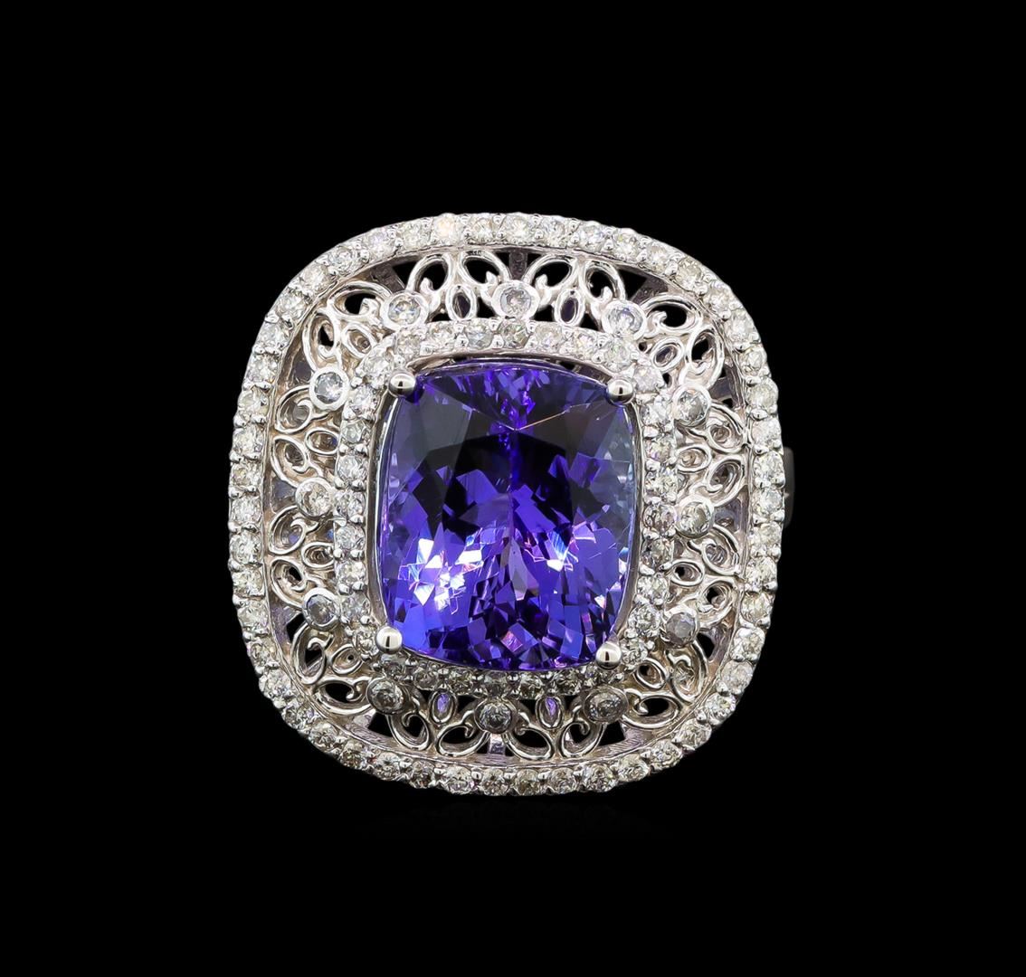 One electronically tested 14KT white gold ladies cast tanzanite and diamond ring with a bright polish finish. Identified with markings of "K14". Condition is new. Containing: One prong set rectangular cushion modified brilliant cut natural tanzanite, measuring 10.90 x 8.80 x 7.00mm, approximate weight of 5.29ct., clarity is eye clean, type I, medium, moderately strong, bluish violet color, (GIA bV 5/4), cut is good. Ninety-Four prong set round brilliant cut diamonds, measuring 1.30 - 1.30 x 0.78mm (depth est.) approximate total weight of 94 Stones = 0.75ct. Clarity: SI-1 to I-1. Color: H - I, Cut is Good. Colored gemstones are presumed to have been subjected to commonly used enhancement processes. All diamonds and colored gemstones are graded in the mounting, unless otherwise stated. Total Weight of Colored Stones 5.29ct. Total Weight of Diamonds 0.75ct. Total Weight of Ring 7.50 grams. GGL Appraised.