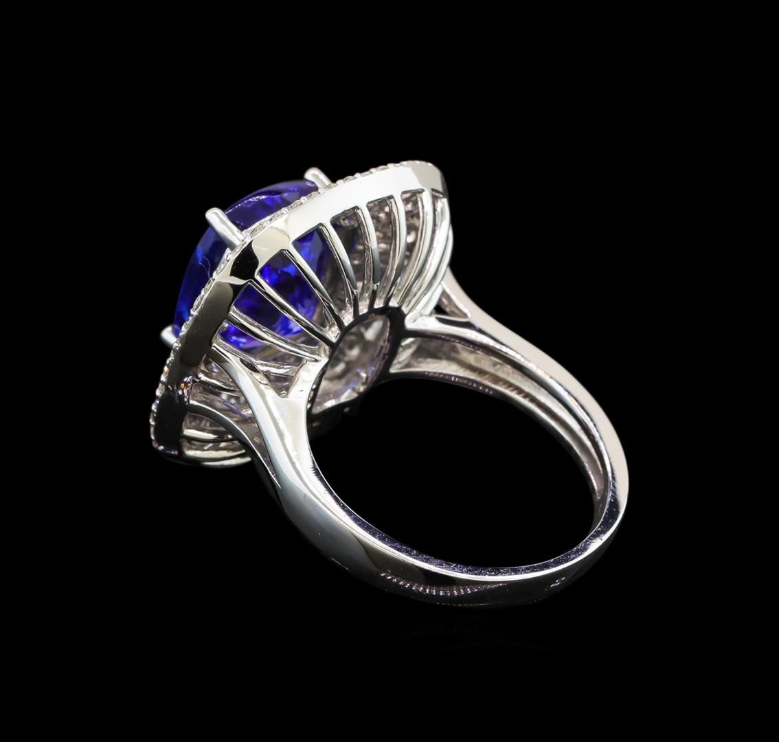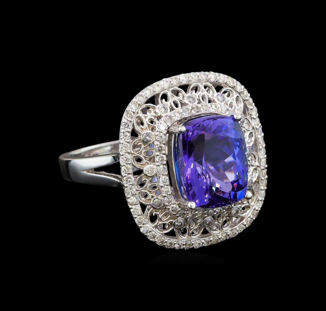 One electronically tested 14KT white gold ladies cast tanzanite and diamond ring with a bright polish finish. Identified with markings of "K14". Condition is new. Containing: One prong set rectangular cushion modified brilliant cut natural tanzanite, measuring 10.90 x 8.80 x 7.00mm, approximate weight of 5.29ct., clarity is eye clean, type I, medium, moderately strong, bluish violet color, (GIA bV 5/4), cut is good. Ninety-Four prong set round brilliant cut diamonds, measuring 1.30 - 1.30 x 0.78mm (depth est.) approximate total weight of 94 Stones = 0.75ct. Clarity: SI-1 to I-1. Color: H - I, Cut is Good. Colored gemstones are presumed to have been subjected to commonly used enhancement processes. All diamonds and colored gemstones are graded in the mounting, unless otherwise stated. Total Weight of Colored Stones 5.29ct. Total Weight of Diamonds 0.75ct. Total Weight of Ring 7.50 grams. GGL Appraised.