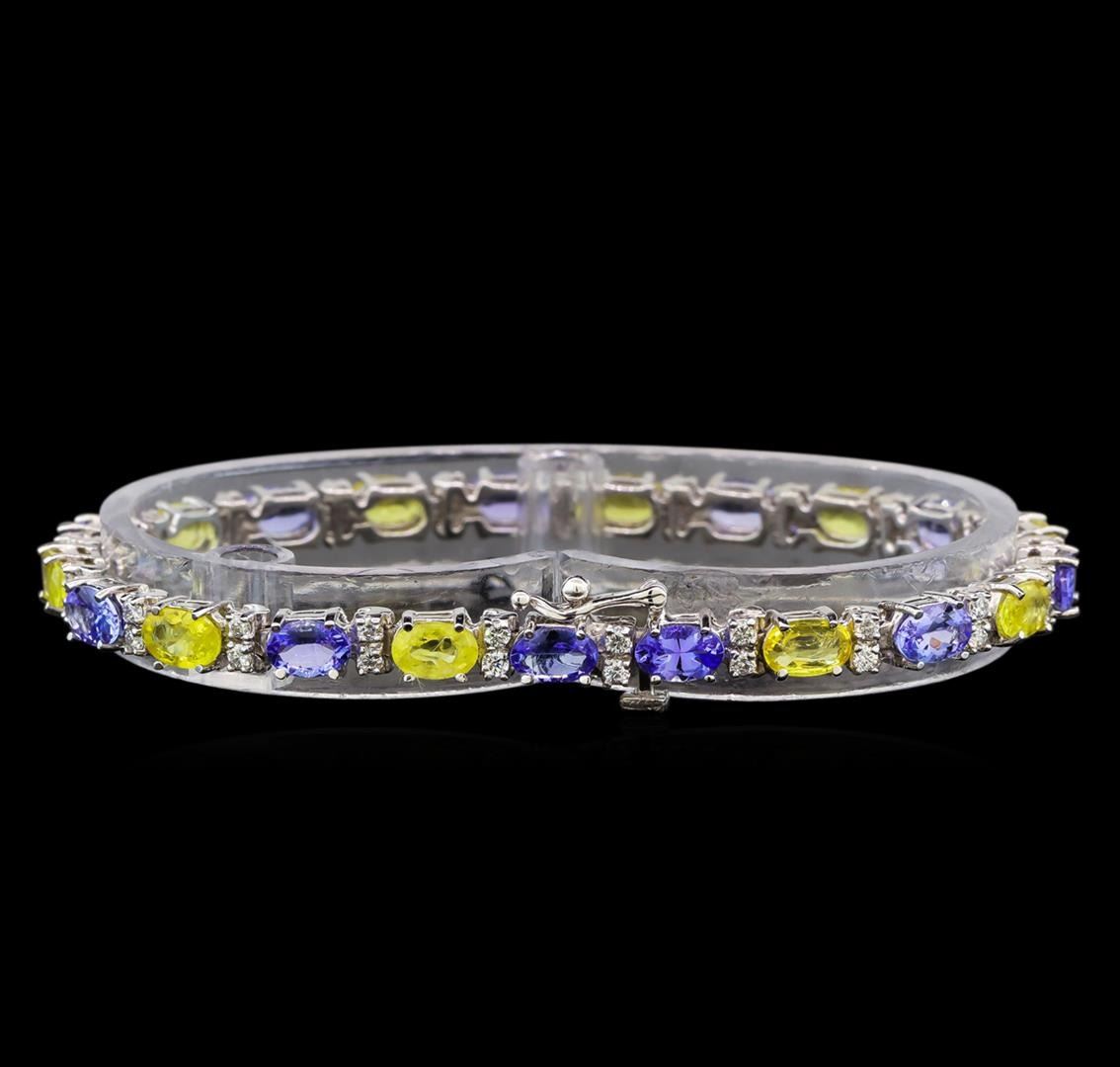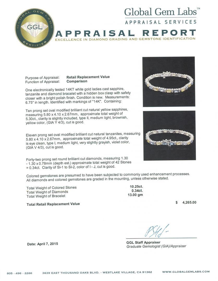 One electronically tested 14KT white gold ladies cast sapphire, tanzanite and diamond bracelet with a hidden box clasp with safety closer with a bright polish finish. Measurements: 6.75" in length. Identified with markings of "14K". Condition is new. Containing: Ten prong set oval modified brilliant cut natural yellow sapphires, measuring 5.80 x 4.10 x 2.67mm, approximate total weight of 5.30ct., clarity is slightly included, type II, medium light, brownish, yellow color, (GIA Y 4/3), cut is good. Eleven prong set oval modified brilliant cut natural tanzanites, measuring 5.80 x 4.10 x 2.67mm, approximate total weight of 4.95ct., clarity is eye clean, type I, medium light, very slightly grayish, violet color, (GIA V 4/3), cut is good. Forty-Two prong set round brilliant cut diamonds, measuring 1.30 - 1.30 x 0.78mm (depth est.) approximate total weight of 42 Stones = 0.34ct. Clarity: SI-1 to SI-2. Color: I - J, Cut is Good. Colored gemstones are presumed to have been subjected to commonly used enhancement processes. All diamonds and colored gemstones are graded in the mounting, unless otherwise stated. Total Weight of Colored Stones 10.25ct. Total Weight of Diamonds 0.34ct. Total Weight of Bracelet 13.00. grams. GGL Appraised at $4,265.00.