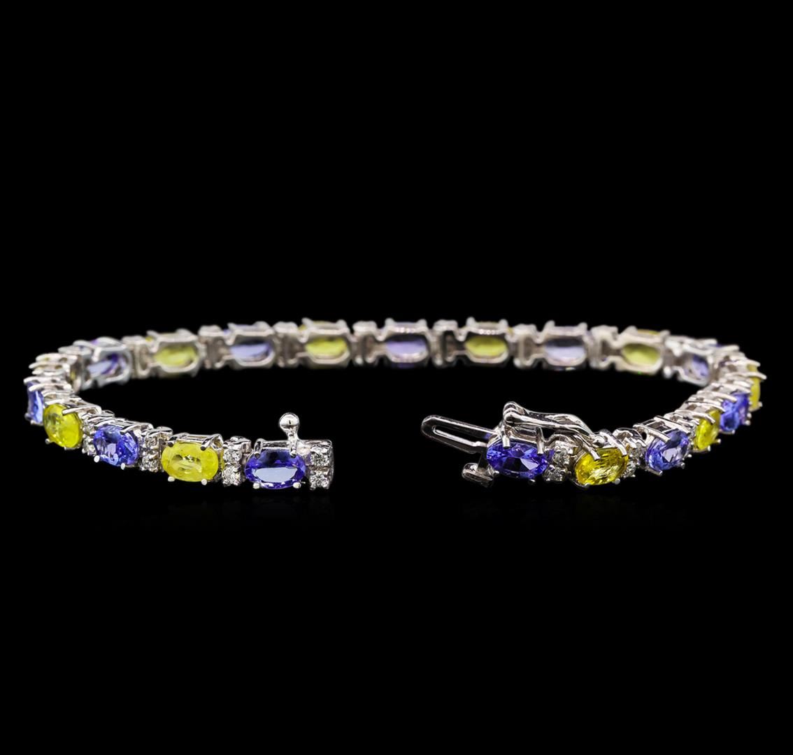 One electronically tested 14KT white gold ladies cast sapphire, tanzanite and diamond bracelet with a hidden box clasp with safety closer with a bright polish finish. Measurements: 6.75" in length. Identified with markings of "14K". Condition is new. Containing: Ten prong set oval modified brilliant cut natural yellow sapphires, measuring 5.80 x 4.10 x 2.67mm, approximate total weight of 5.30ct., clarity is slightly included, type II, medium light, brownish, yellow color, (GIA Y 4/3), cut is good. Eleven prong set oval modified brilliant cut natural tanzanites, measuring 5.80 x 4.10 x 2.67mm, approximate total weight of 4.95ct., clarity is eye clean, type I, medium light, very slightly grayish, violet color, (GIA V 4/3), cut is good. Forty-Two prong set round brilliant cut diamonds, measuring 1.30 - 1.30 x 0.78mm (depth est.) approximate total weight of 42 Stones = 0.34ct. Clarity: SI-1 to SI-2. Color: I - J, Cut is Good. Colored gemstones are presumed to have been subjected to commonly used enhancement processes. All diamonds and colored gemstones are graded in the mounting, unless otherwise stated. Total Weight of Colored Stones 10.25ct. Total Weight of Diamonds 0.34ct. Total Weight of Bracelet 13.00. grams. GGL Appraised at $4,265.00.
