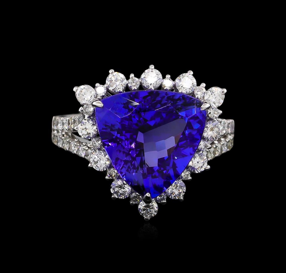 One electronically tested 14KT white gold ladies cast tanzanite and diamond ring with a bright polish finish. Condition is new, good workmanship. The featured tanzanite is set within a diamond lattice gallery, supported by diamond set split shoulders and completed by a two and one-half millimeter wide band. Identified with markings of "14K 585". Containing: One prong set triangle mixed cut natural tanzanite, measuring 11.50 x 11.70 x 6.05mm, 8%. bulge factor, approximate weight of 5.30ct., clarity is eye clean, type I, medium dark, very slightly grayish, bluish violet color, (GIA bV 6/3), cut is good. Transmitting light with no distortion, transparent. Colored Stone Grading Report attached. Graded in the setting. Tanzanite is a very rare gemstone that is only found in the country of Tanzania. Originally discovered in 1967. Tiffany & Company, named the stone Tanzanite. It is found in the Usumburu Mountains that border the Umba Valley of northern Tanzania. Tanzanite occurs in gray, brown, violet, blue, reddish-purple, & green. The gem is interesting because of its exceptional pleochroism. Rotated in different directions a tanzanite will exhibit multiple changes of color. Tanzanite has a low tolerance to ultrasonic cleaning, and should not be cleaned using this method. Forty prong set round brilliant cut diamonds, measuring 1.50 - 1.20 x 0.81mm (depth est.) approximate. Total Weight of 40 Stones = 0.46ct. Graded in the setting. Clarity: SI-2 to I-2. Color: G - I Twelve prong set round brilliant cut diamonds, measuring 2.20 - 2.20 x 1.32mm (depth est.) approximate. Total Weight of 12 Stones = 0.56ct. Graded in the setting. Clarity: I-1 to I-2. Color: G - I. Total Weight of Colored Stones 5.30ct. Total Weight of Diamonds 1.02ct. Total Weight of Ring 5.40 grams. AIG Appraised at $16,150.00.