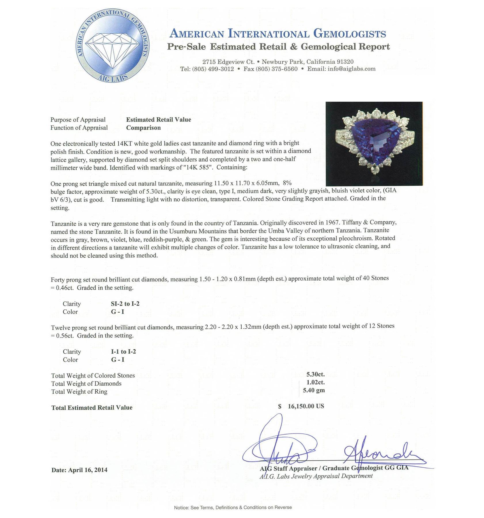 One electronically tested 14KT white gold ladies cast tanzanite and diamond ring with a bright polish finish. Condition is new, good workmanship. The featured tanzanite is set within a diamond lattice gallery, supported by diamond set split shoulders and completed by a two and one-half millimeter wide band. Identified with markings of "14K 585". Containing: One prong set triangle mixed cut natural tanzanite, measuring 11.50 x 11.70 x 6.05mm, 8%. bulge factor, approximate weight of 5.30ct., clarity is eye clean, type I, medium dark, very slightly grayish, bluish violet color, (GIA bV 6/3), cut is good. Transmitting light with no distortion, transparent. Colored Stone Grading Report attached. Graded in the setting. Tanzanite is a very rare gemstone that is only found in the country of Tanzania. Originally discovered in 1967. Tiffany & Company, named the stone Tanzanite. It is found in the Usumburu Mountains that border the Umba Valley of northern Tanzania. Tanzanite occurs in gray, brown, violet, blue, reddish-purple, & green. The gem is interesting because of its exceptional pleochroism. Rotated in different directions a tanzanite will exhibit multiple changes of color. Tanzanite has a low tolerance to ultrasonic cleaning, and should not be cleaned using this method. Forty prong set round brilliant cut diamonds, measuring 1.50 - 1.20 x 0.81mm (depth est.) approximate. Total Weight of 40 Stones = 0.46ct. Graded in the setting. Clarity: SI-2 to I-2. Color: G - I Twelve prong set round brilliant cut diamonds, measuring 2.20 - 2.20 x 1.32mm (depth est.) approximate. Total Weight of 12 Stones = 0.56ct. Graded in the setting. Clarity: I-1 to I-2. Color: G - I. Total Weight of Colored Stones 5.30ct. Total Weight of Diamonds 1.02ct. Total Weight of Ring 5.40 grams. AIG Appraised at $16,150.00.