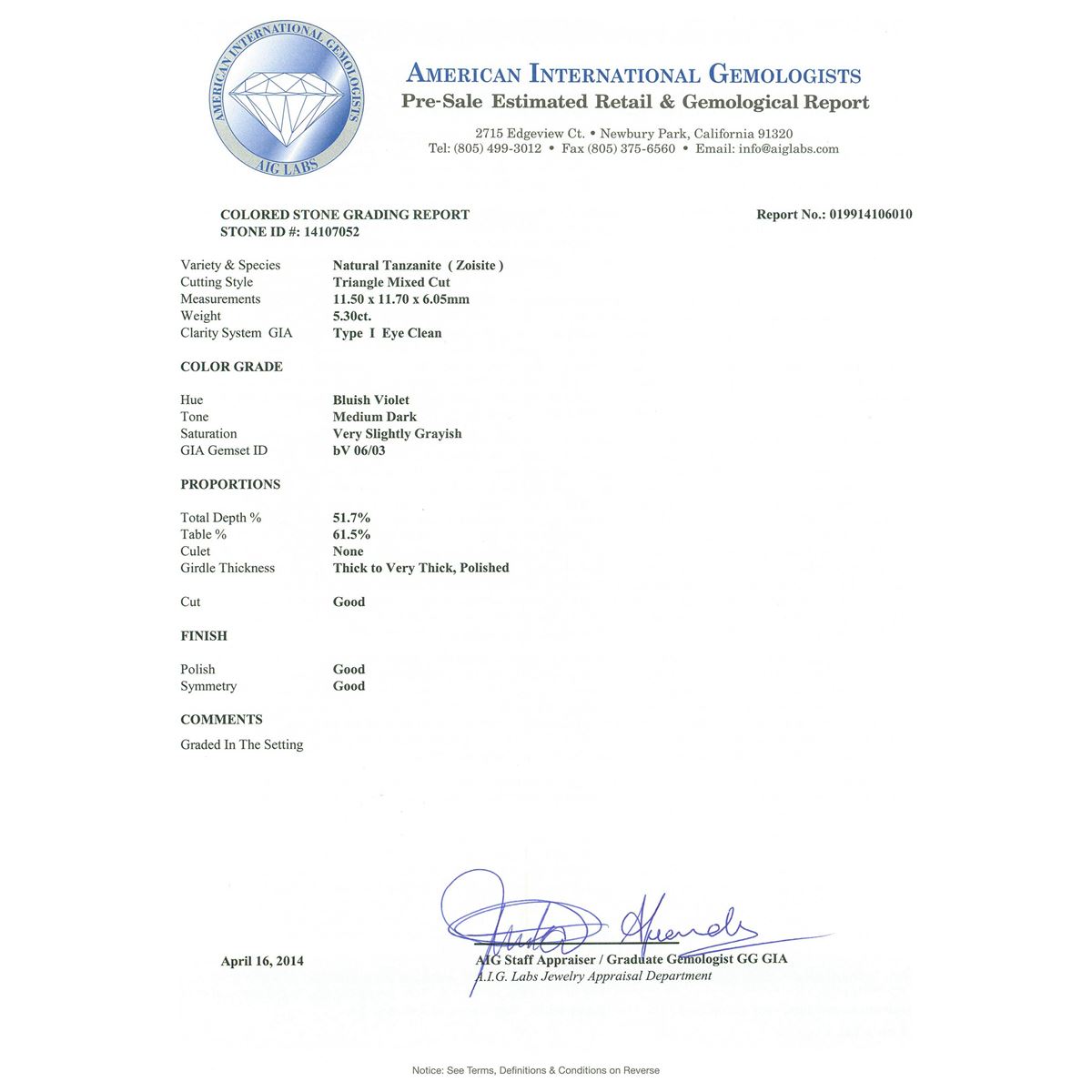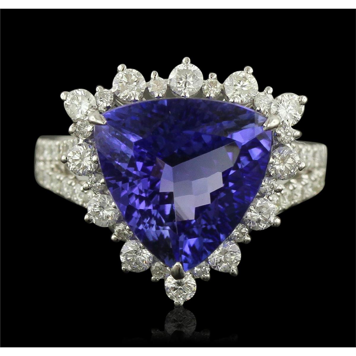 One electronically tested 14KT white gold ladies cast tanzanite and diamond ring with a bright polish finish. Condition is new, good workmanship. The featured tanzanite is set within a diamond lattice gallery, supported by diamond set split shoulders and completed by a two and one-half millimeter wide band. Identified with markings of "14K 585". Containing: One prong set triangle mixed cut natural tanzanite, measuring 11.50 x 11.70 x 6.05mm, 8%. bulge factor, approximate weight of 5.30ct., clarity is eye clean, type I, medium dark, very slightly grayish, bluish violet color, (GIA bV 6/3), cut is good. Transmitting light with no distortion, transparent. Colored Stone Grading Report attached. Graded in the setting. Tanzanite is a very rare gemstone that is only found in the country of Tanzania. Originally discovered in 1967. Tiffany & Company, named the stone Tanzanite. It is found in the Usumburu Mountains that border the Umba Valley of northern Tanzania. Tanzanite occurs in gray, brown, violet, blue, reddish-purple, & green. The gem is interesting because of its exceptional pleochroism. Rotated in different directions a tanzanite will exhibit multiple changes of color. Tanzanite has a low tolerance to ultrasonic cleaning, and should not be cleaned using this method. Forty prong set round brilliant cut diamonds, measuring 1.50 - 1.20 x 0.81mm (depth est.) approximate. Total Weight of 40 Stones = 0.46ct. Graded in the setting. Clarity: SI-2 to I-2. Color: G - I Twelve prong set round brilliant cut diamonds, measuring 2.20 - 2.20 x 1.32mm (depth est.) approximate. Total Weight of 12 Stones = 0.56ct. Graded in the setting. Clarity: I-1 to I-2. Color: G - I. Total Weight of Colored Stones 5.30ct. Total Weight of Diamonds 1.02ct. Total Weight of Ring 5.40 grams. AIG Appraised at $16,150.00.