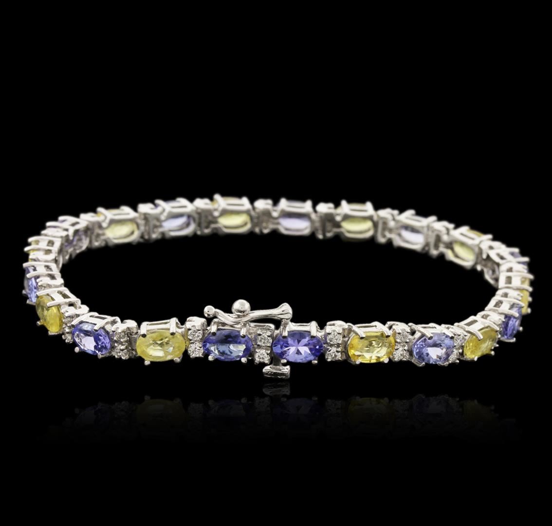 One electronically tested 14KT white gold ladies cast sapphire, tanzanite and diamond bracelet with a hidden box clasp with safety closer with a bright polish finish. Measurements: 6.75" in length. Identified with markings of "14K". Condition is new. Containing: Ten prong set oval modified brilliant cut natural yellow sapphires, measuring 5.80 x 4.10 x 2.67mm, approximate total weight of 5.30ct., clarity is slightly included, type II, medium light, brownish, yellow color, (GIA Y 4/3), cut is good. Eleven prong set oval modified brilliant cut natural tanzanites, measuring 5.80 x 4.10 x 2.67mm, approximate total weight of 4.95ct., clarity is eye clean, type I, medium light, very slightly grayish, violet color, (GIA V 4/3), cut is good. Forty-Two prong set round brilliant cut diamonds, measuring 1.30 - 1.30 x 0.78mm (depth est.) approximate total weight of 42 Stones = 0.34ct. Clarity: SI-1 to SI-2. Color: I - J, Cut is Good. Colored gemstones are presumed to have been subjected to commonly used enhancement processes. All diamonds and colored gemstones are graded in the mounting, unless otherwise stated. Total Weight of Colored Stones 10.25ct. Total Weight of Diamonds 0.34ct. Total Weight of Bracelet 13.00. grams. GGL Appraised at $4,265.00.