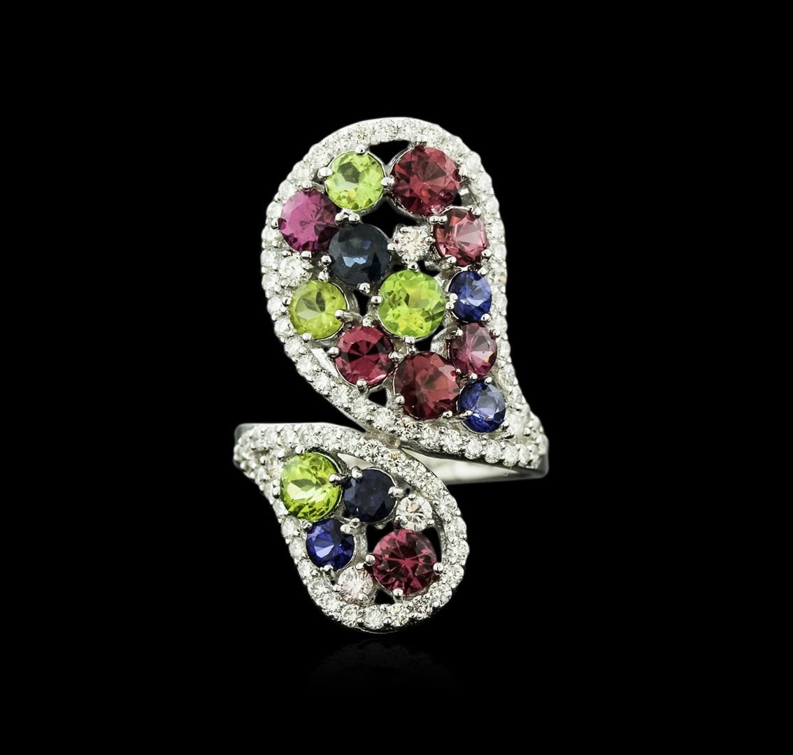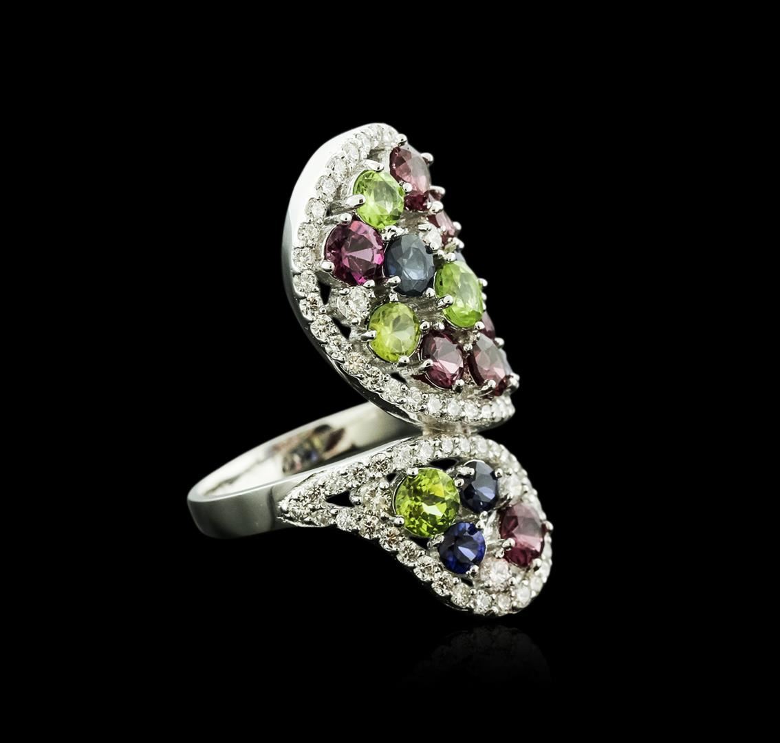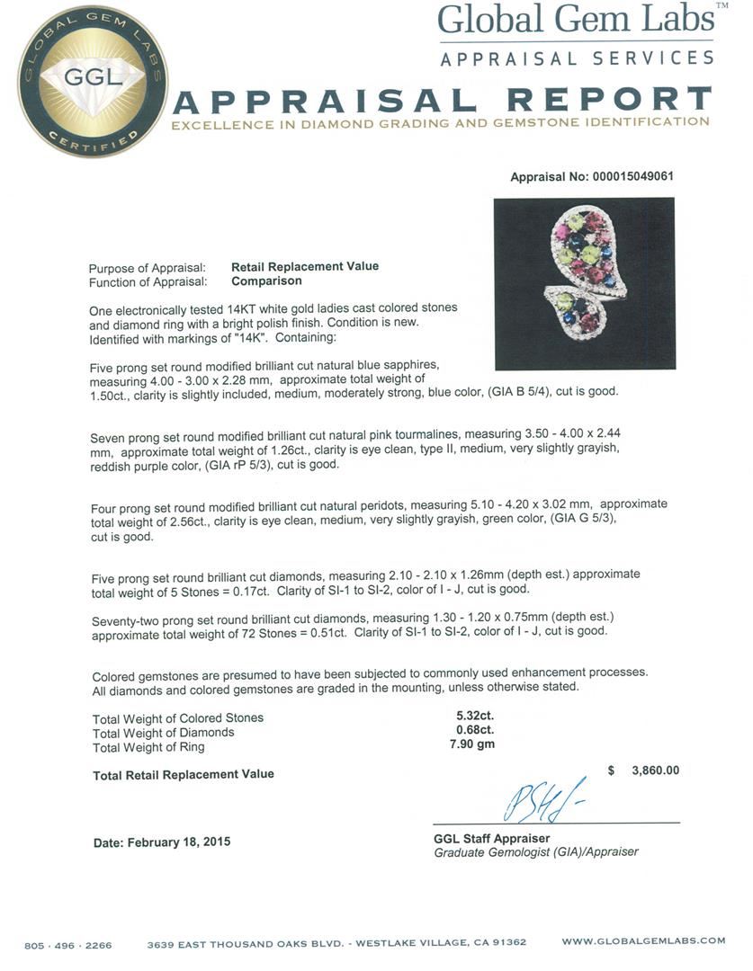 One electronically tested 14KT white gold ladies cast colored stones and diamond ring with a bright polish finish. Identified with markings of "14K". Condition is new. Containing: Five prong set round modified brilliant cut natural blue sapphires, measuring 4.00 - 3.00 x 2.28 mm, approximate total weight of 1.50ct., clarity is slightly included, medium, moderately strong, blue color, (GIA B 5/4), cut is good. Seven prong set round modified brilliant cut natural pink tourmalines, measuring 3.50 - 4.00 x 2.44 mm, approximate total weight of 1.26ct., clarity is eye clean, type II, medium, very slightly grayish, reddish purple color, (GIA rP 5/3), cut is good. Four prong set round modified brilliant cut natural peridots, measuring 5.10 - 4.20 x 3.02 mm, approximate total weight of 2.56ct., clarity is eye clean, medium, very slightly grayish, green color, (GIA G 5/3), cut is good. Five prong set round brilliant cut diamonds, measuring 2.10 - 2.10 x 1.26mm (depth est.) approximate total weight of 5 Stones = 0.17ct. Clarity: SI-1 to SI-2. Color: I - J, Cut is Good. Seventy-Two prong set round brilliant cut diamonds, measuring 1.30 - 1.20 x 0.75mm (depth est.) approximate total weight of 72 Stones = 0.51ct. Clarity: SI-1 to SI-2. Color: I - J, Cut is Good. Colored gemstones are presumed to have been subjected to commonly used enhancement processes. All diamonds and colored gemstones are graded in the mounting, unless otherwise stated. Total Weight of Colored Stones 5.32ct. Total Weight of Diamonds 0.68ct. Total Weight of Ring 7.90 grams. GGL Appraised at $3,860.00.