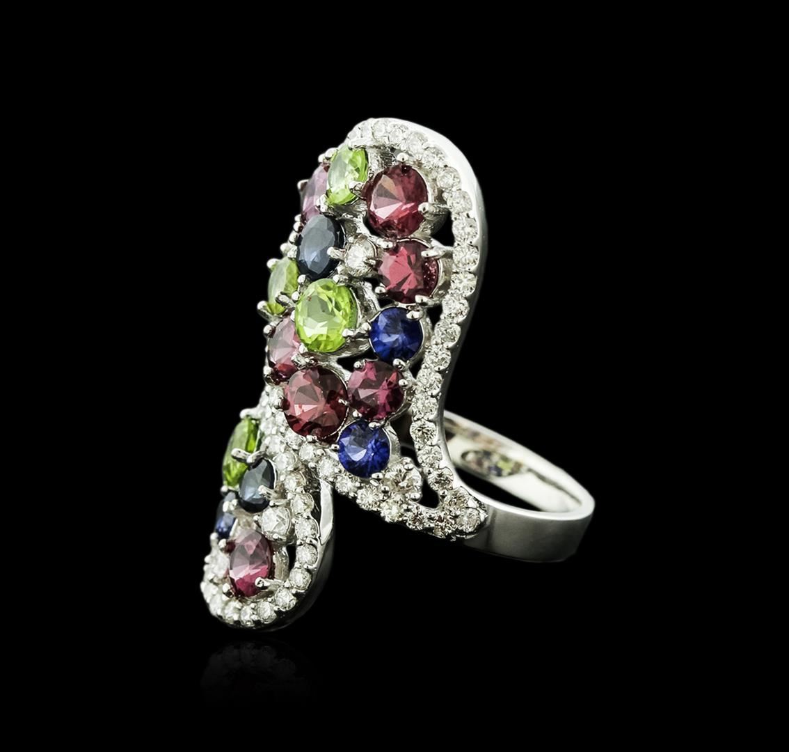 One electronically tested 14KT white gold ladies cast colored stones and diamond ring with a bright polish finish. Identified with markings of "14K". Condition is new. Containing: Five prong set round modified brilliant cut natural blue sapphires, measuring 4.00 - 3.00 x 2.28 mm, approximate total weight of 1.50ct., clarity is slightly included, medium, moderately strong, blue color, (GIA B 5/4), cut is good. Seven prong set round modified brilliant cut natural pink tourmalines, measuring 3.50 - 4.00 x 2.44 mm, approximate total weight of 1.26ct., clarity is eye clean, type II, medium, very slightly grayish, reddish purple color, (GIA rP 5/3), cut is good. Four prong set round modified brilliant cut natural peridots, measuring 5.10 - 4.20 x 3.02 mm, approximate total weight of 2.56ct., clarity is eye clean, medium, very slightly grayish, green color, (GIA G 5/3), cut is good. Five prong set round brilliant cut diamonds, measuring 2.10 - 2.10 x 1.26mm (depth est.) approximate total weight of 5 Stones = 0.17ct. Clarity: SI-1 to SI-2. Color: I - J, Cut is Good. Seventy-Two prong set round brilliant cut diamonds, measuring 1.30 - 1.20 x 0.75mm (depth est.) approximate total weight of 72 Stones = 0.51ct. Clarity: SI-1 to SI-2. Color: I - J, Cut is Good. Colored gemstones are presumed to have been subjected to commonly used enhancement processes. All diamonds and colored gemstones are graded in the mounting, unless otherwise stated. Total Weight of Colored Stones 5.32ct. Total Weight of Diamonds 0.68ct. Total Weight of Ring 7.90 grams. GGL Appraised at $3,860.00.