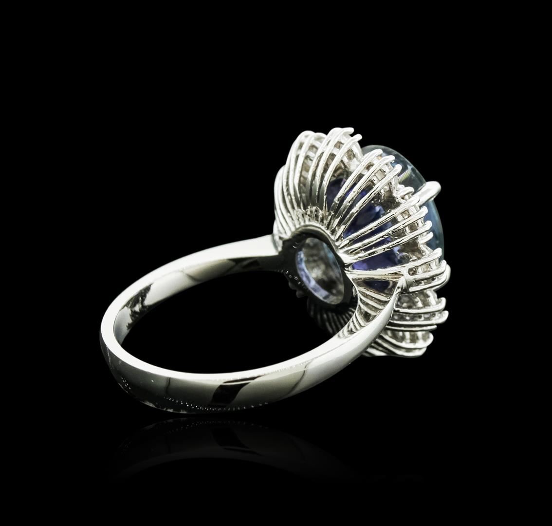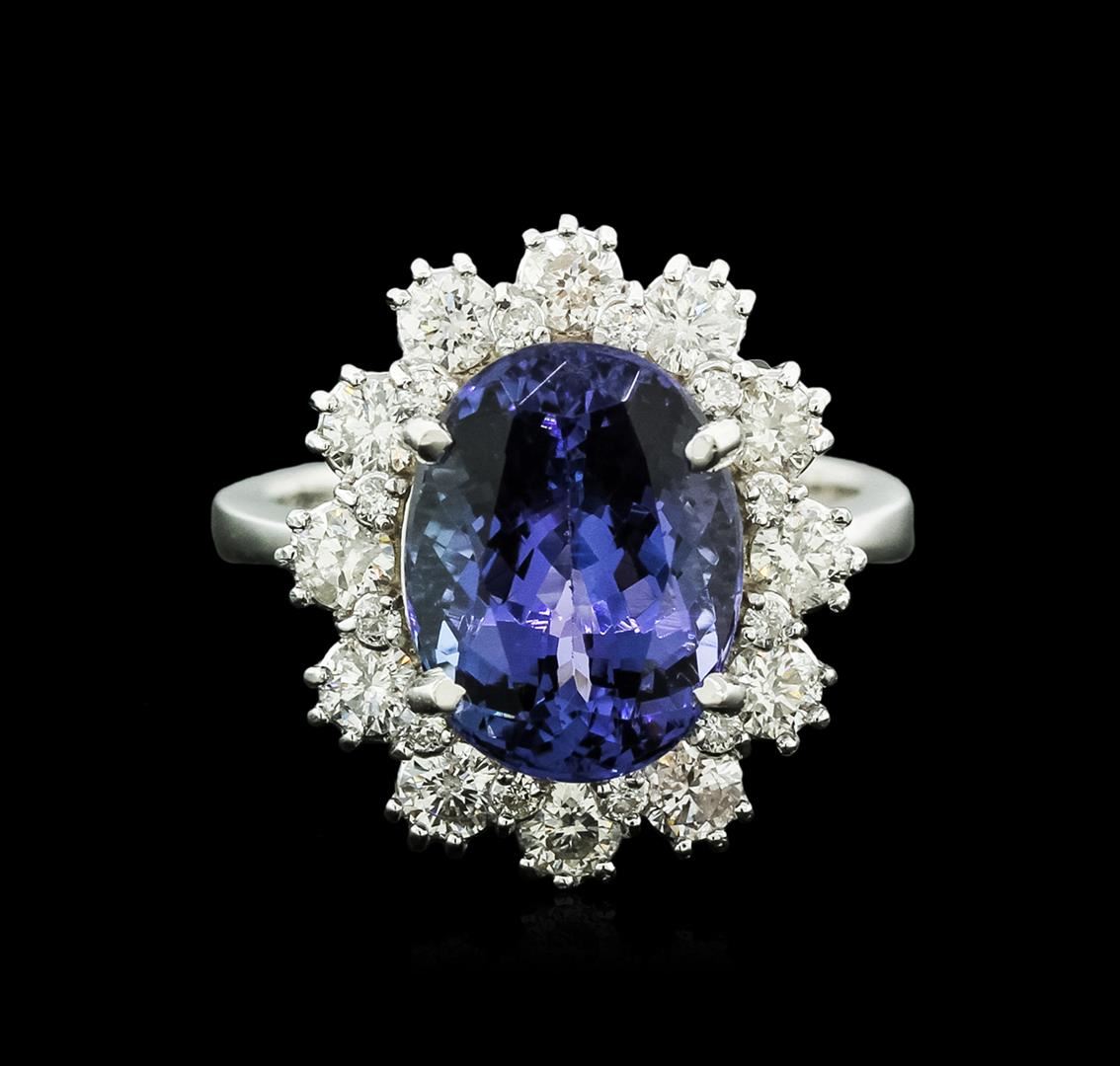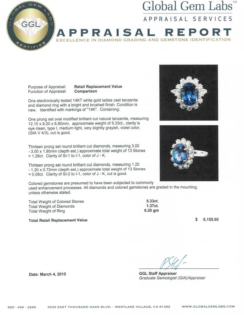 One electronically tested 14KT white gold ladies cast tanzanite and diamond ring with a bright and brushed finish. Identified with markings of "14K". Condition is new. Containing: One prong set oval modified brilliant cut natural tanzanite, measuring 12.10 x 9.20 x 6.80mm, approximate weight of 5.33ct., clarity is eye clean, type I, medium light, very slightly grayish, violet color, (GIA V 4/3), cut is good. Thirteen prong set round brilliant cut diamonds, measuring 3.00. - 3.00. x 1.80mm (depth est.) approximate total weight of 13 Stones = 1.28ct. Clarity: SI-1 to I-1. Color: J - K. Thirteen prong set round brilliant cut diamonds, measuring 1.20 - 1.20 x 0.72mm (depth est.) approximate total weight of 13 Stones = 0.08ct. Clarity: SI-2 to I-1. Color: J - K, Cut is Good. Colored gemstones are presumed to have been subjected to commonly used enhancement processes. All diamonds and colored gemstones are graded in the mounting, unless otherwise stated. Total Weight of Colored Stones 5.33ct. Total Weight of Diamonds 1.37ct. Total Weight of Ring 6.20 grams. GGL Appraised at $6,155.00.