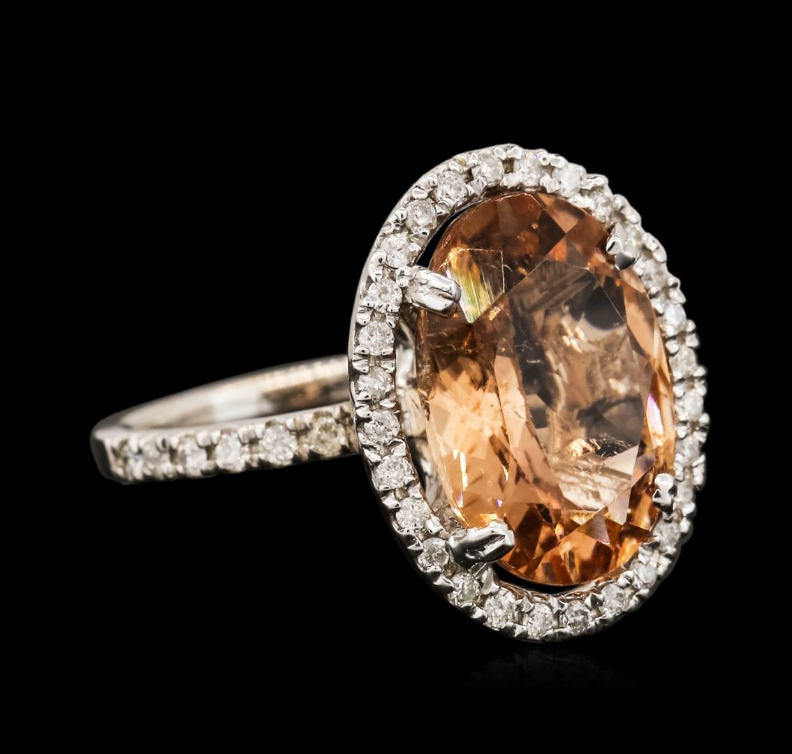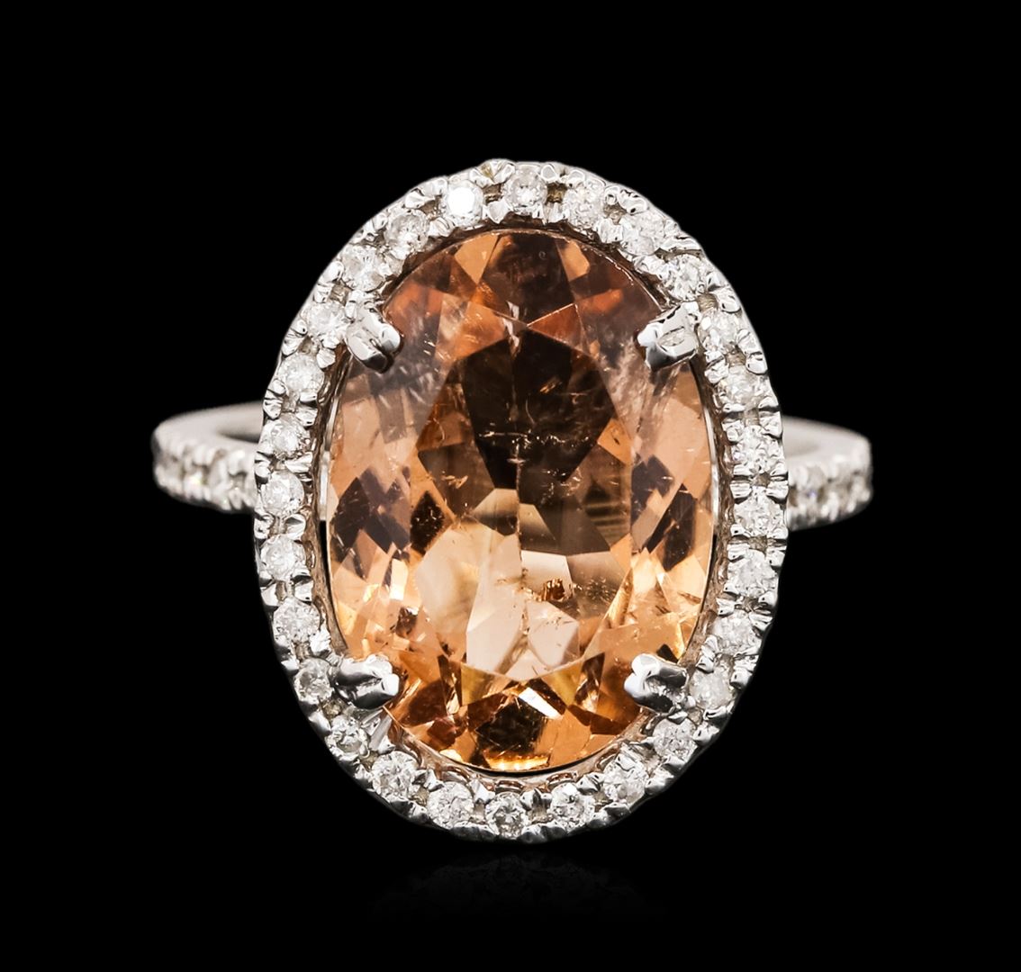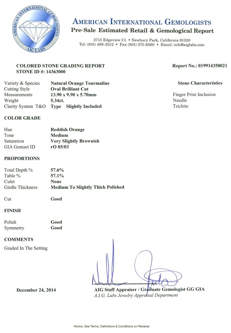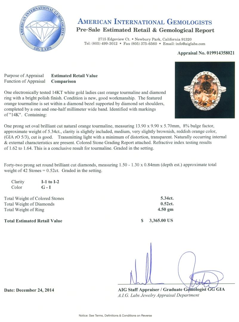 One electronically tested 14KT white gold ladies cast orange tourmaline and diamond ring with a bright polish finish. The featured orange tourmaline is set within a diamond bezel supported by diamond set shoulders, completed by a one and one-half millimeter wide band. Identified with markings of "14K". Condition is new, good workmanship. Containing: One prong set oval brilliant cut natural orange tourmaline, measuring 13.90 x 9.90 x 5.70mm, 8% bulge factor, approximate weight of 5.34ct., clarity is slightly included, medium, very slightly brownish, reddish orange color, (GIA rO 5/3), cut is good. Transmitting light with a minimum of distortion, transparent. Naturally occurring internal & external characteristics are present. Colored Stone Grading Report attached. Refractive index testing results of 1.62 to 1.64. This is a conclusive result for tourmaline. Graded in the setting. Forty-Two prong set round brilliant cut diamonds, measuring 1.50 - 1.30 x 0.84mm (depth est.) approximate total weight of 42 Stones = 0.52ct. Graded in the setting. Clarity: I-1 to I-2. Color: G - I. Total Weight of Colored Stones 5.34ct. Total Weight of Diamonds 0.52ct. Total Weight of Ring 4.50 grams. AIG Appraised at $3,365.00.
