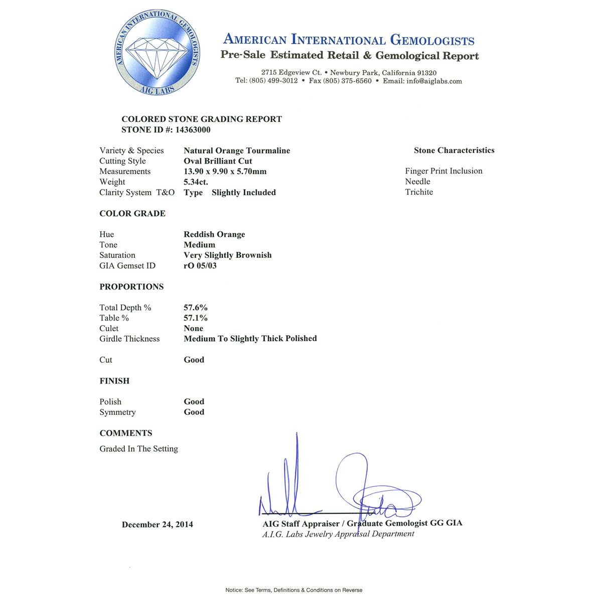 One electronically tested 14KT white gold ladies cast orange tourmaline and diamond ring with a bright polish finish. The featured orange tourmaline is set within a diamond bezel supported by diamond set shoulders, completed by a one and one-half millimeter wide band. Identified with markings of "14K". Condition is new, good workmanship. Containing: One prong set oval brilliant cut natural orange tourmaline, measuring 13.90 x 9.90 x 5.70mm, 8% bulge factor, approximate weight of 5.34ct., clarity is slightly included, medium, very slightly brownish, reddish orange color, (GIA rO 5/3), cut is good. Transmitting light with a minimum of distortion, transparent. Naturally occurring internal & external characteristics are present. Colored Stone Grading Report attached. Refractive index testing results of 1.62 to 1.64. This is a conclusive result for tourmaline. Graded in the setting. Forty-Two prong set round brilliant cut diamonds, measuring 1.50 - 1.30 x 0.84mm (depth est.) approximate total weight of 42 Stones = 0.52ct. Graded in the setting. Clarity: I-1 to I-2. Color: G - I. Total Weight of Colored Stones 5.34ct. Total Weight of Diamonds 0.52ct. Total Weight of Ring 4.50 grams. AIG Appraised at $3,365.00.