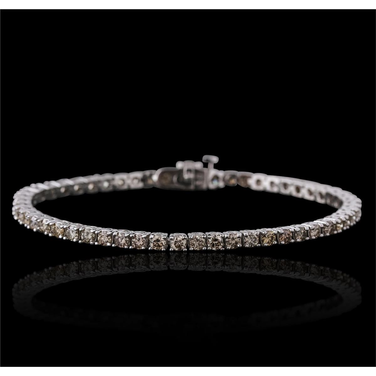 One electronically tested 14KT white gold ladies combination cast & assembled tennis bracelet with a hidden box clasp with a bright polish finish. Measurements: 7" in length. Identified with markings of "14K". Condition is new. Containing: Fifty-Four prong set round brilliant cut diamonds, measuring 3.00 - 3.00 x 1.80mm (depth est.) approximate total weight of 54 Stones = 5.34ct. Clarity: VS-2 to SI-2, Cut is Good. All diamonds are graded in the mounting, unless otherwise stated. Total Weight of Diamonds 5.34ct. Total Weight of Bracelet 12.30 grams. GGL Appraised at $9,635.00.