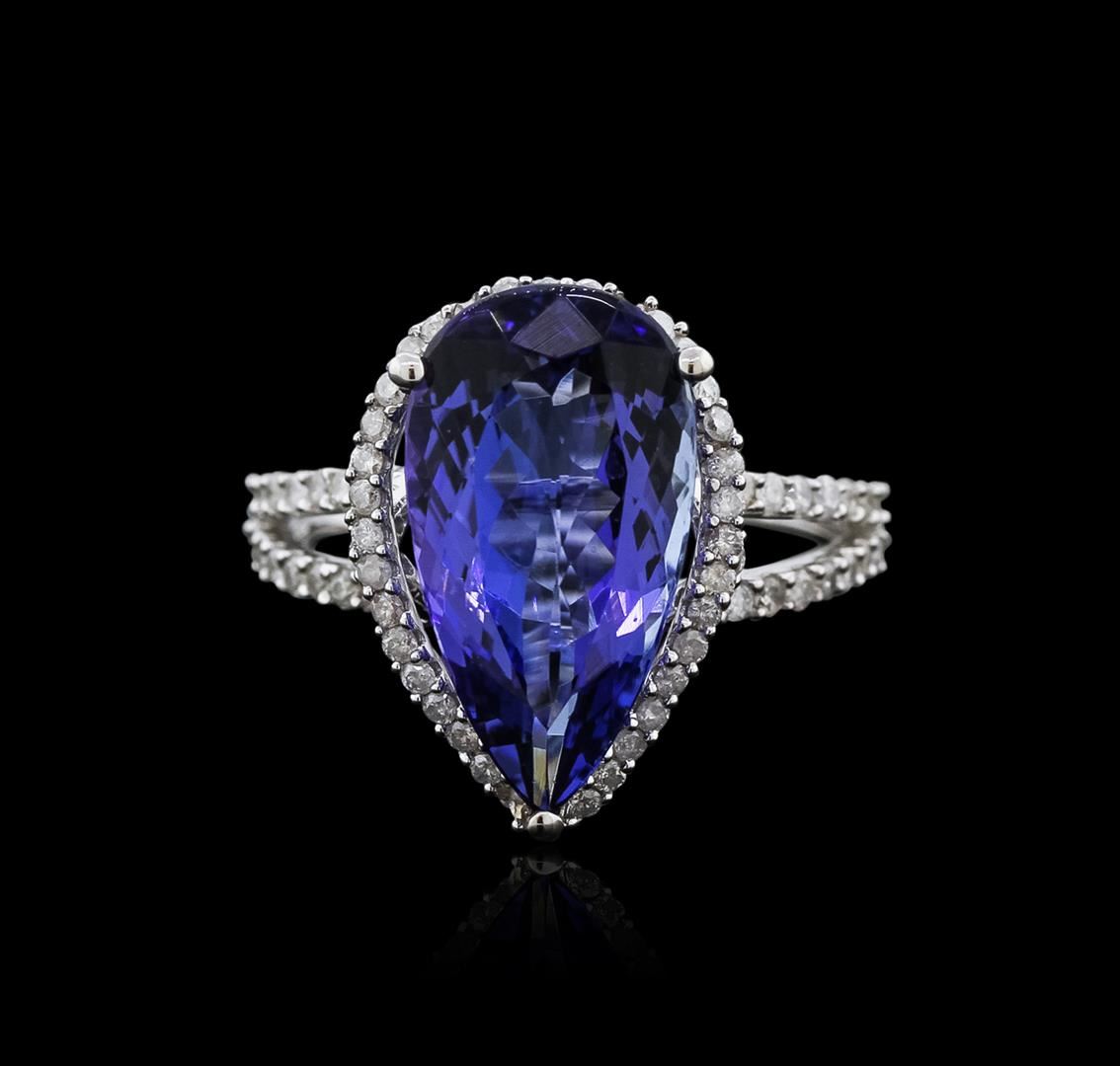 One electronically tested 14KT white gold ladies cast tanzanite and diamond ring with a split shank with a bright polish finish. Trademark is Orianne. Identified with markings of "14K". Condition is new. Containing: One prong set pear modified brilliant cut natural tanzanite, measuring 17.00 x 8.88 x 5.30mm, approximate weight of 5.36ct., clarity is eye clean, type I, medium, moderately strong, bluish violet color, (GIA bV 5/4), cut is good. Eight prong set round brilliant cut diamonds, measuring 1.10 - 1.10 x 0.66mm (depth est.) approximate total weight of 8 Stones = 0.04ct. Clarity: I-1 to I-2. Color: I - J, Cut is Good. All diamonds and colored gemstones are graded in the mounting, unless otherwise stated. Colored gemstones are presumed to have been subjected to commonly used enhancement processes. Total Weight of Colored Stones 5.36ct. Total Weight of Diamonds 0.04ct. Total Weight of Ring 4.30 grams. GGL Appraised at $6,395.00.