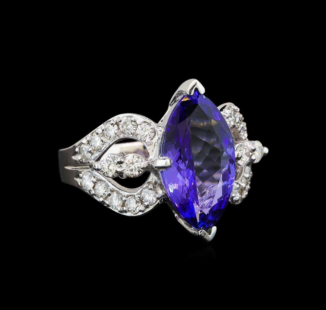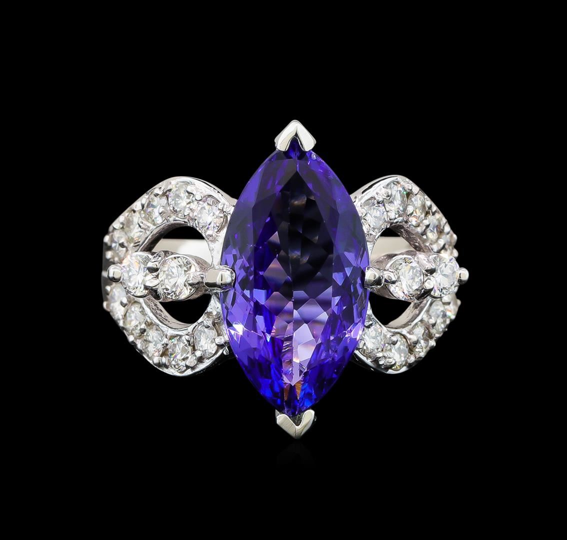 One electronically tested 14KT white gold ladies cast tanzanite and diamond ring with a bright polish finish. Identified with markings of "14K". Condition is new. Containing: One prong set marquise modified brilliant cut natural tanzanite, measuring 16.00. x 9.00. x 5.86mm, approximate weight of 5.37ct., clarity is eye clean, type I, medium light, very slightly grayish, bluish violet color, (GIA bV 4/3), cut is good. Twenty-Four prong set round brilliant cut diamonds, measuring 2.50 - 2.00. x 1.35mm (depth est.) approximate total weight of 24 Stones = 0.70ct. Clarity: SI-1 to SI-2. Color: I - J. All diamonds and colored gemstones are graded in the mounting, unless otherwise stated. Colored gemstones are presumed to have been subjected to commonly used enhancement processes. Total Weight of Colored Stones 5.37ct. Total Weight of Diamonds 0.70ct. Total Weight of Ring 8.20 grams. GGL Appraised at $5,980.00.