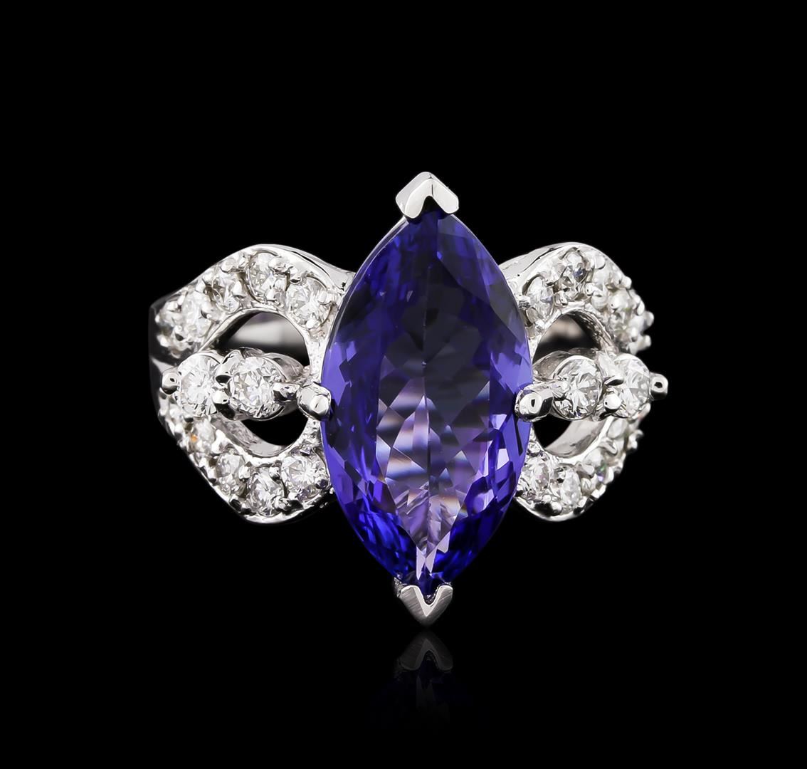 One electronically tested 14KT white gold ladies cast tanzanite and diamond ring with a bright polish finish. Identified with markings of "14K". Condition is new. Containing: One prong set marquise modified brilliant cut natural tanzanite, measuring 16.00. x 9.00. x 5.86mm, approximate weight of 5.37ct., clarity is eye clean, type I, medium light, very slightly grayish, bluish violet color, (GIA bV 4/3), cut is good. Twenty-Four prong set round brilliant cut diamonds, measuring 2.50 - 2.00. x 1.35mm (depth est.) approximate total weight of 24 Stones = 0.70ct. Clarity: SI-1 to SI-2. Color: I - J. All diamonds and colored gemstones are graded in the mounting, unless otherwise stated. Colored gemstones are presumed to have been subjected to commonly used enhancement processes. Total Weight of Colored Stones 5.37ct. Total Weight of Diamonds 0.70ct. Total Weight of Ring 8.20 grams. GGL Appraised at $5,980.00.