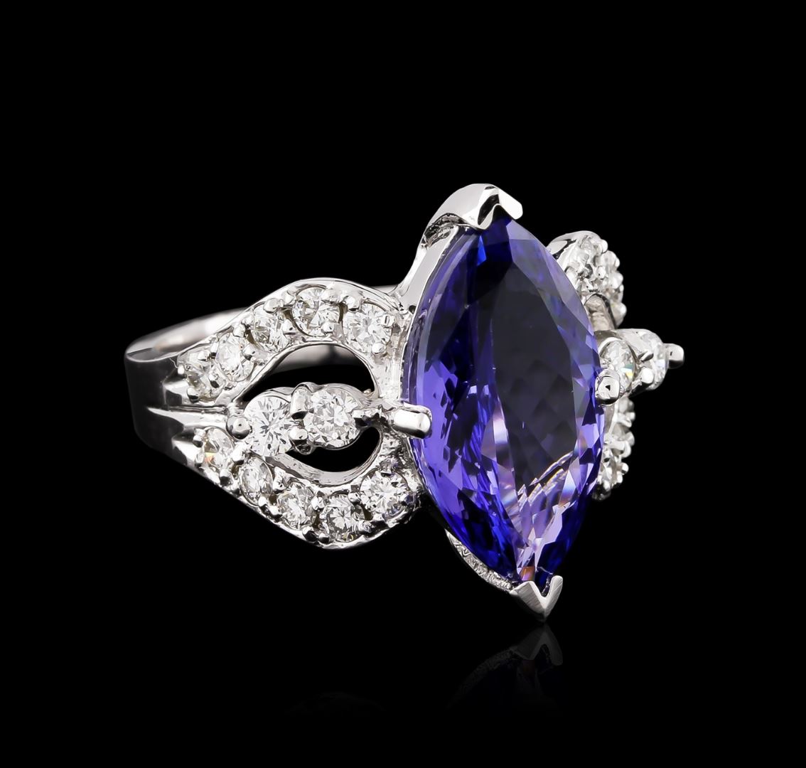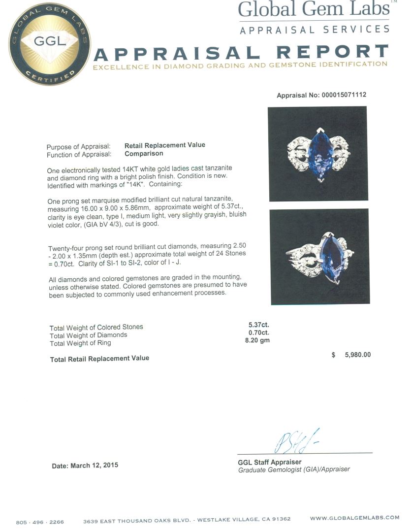 One electronically tested 14KT white gold ladies cast tanzanite and diamond ring with a bright polish finish. Identified with markings of "14K". Condition is new. Containing: One prong set marquise modified brilliant cut natural tanzanite, measuring 16.00. x 9.00. x 5.86mm, approximate weight of 5.37ct., clarity is eye clean, type I, medium light, very slightly grayish, bluish violet color, (GIA bV 4/3), cut is good. Twenty-Four prong set round brilliant cut diamonds, measuring 2.50 - 2.00. x 1.35mm (depth est.) approximate total weight of 24 Stones = 0.70ct. Clarity: SI-1 to SI-2. Color: I - J. All diamonds and colored gemstones are graded in the mounting, unless otherwise stated. Colored gemstones are presumed to have been subjected to commonly used enhancement processes. Total Weight of Colored Stones 5.37ct. Total Weight of Diamonds 0.70ct. Total Weight of Ring 8.20 grams. GGL Appraised at $5,980.00.