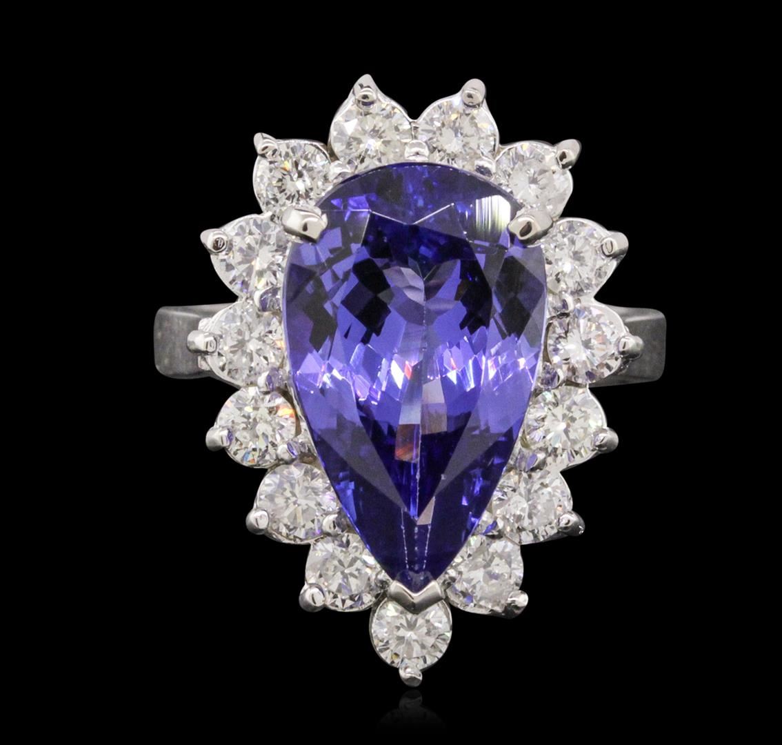 One electronically tested 14KT white gold ladies combination cast & assembled ring with a bright polish finish. Condition is new. Identified with markings of "K14". Containing: One prong set pear modified brilliant cut natural tanzanite, measuring 15.30 x 9.54 x 5.50mm, approximate weight of 5.38ct., clarity is eye clean, type I, medium, moderately strong, violetish blue color, (GIA vB 5/4), cut is good. Fifteen prong set round brilliant cut diamonds, measuring 3.00 - 3.00 x 1.80mm (depth est.) approximate. Total Weight of 15 Stones = 1.48ct. Clarity: SI-2 to I-1. Color: J - K, Cut is Good. Colored gemstones are presumed to have been subjected to commonly used enhancement processes. All diamonds and colored gemstones are graded in the mounting, unless otherwise stated. Total Weight of Colored Stones 5.38ct. Total Weight of Diamonds 1.48ct. Total Weight of Ring 7.10 grams. GGL Appraised at $12,470.00.