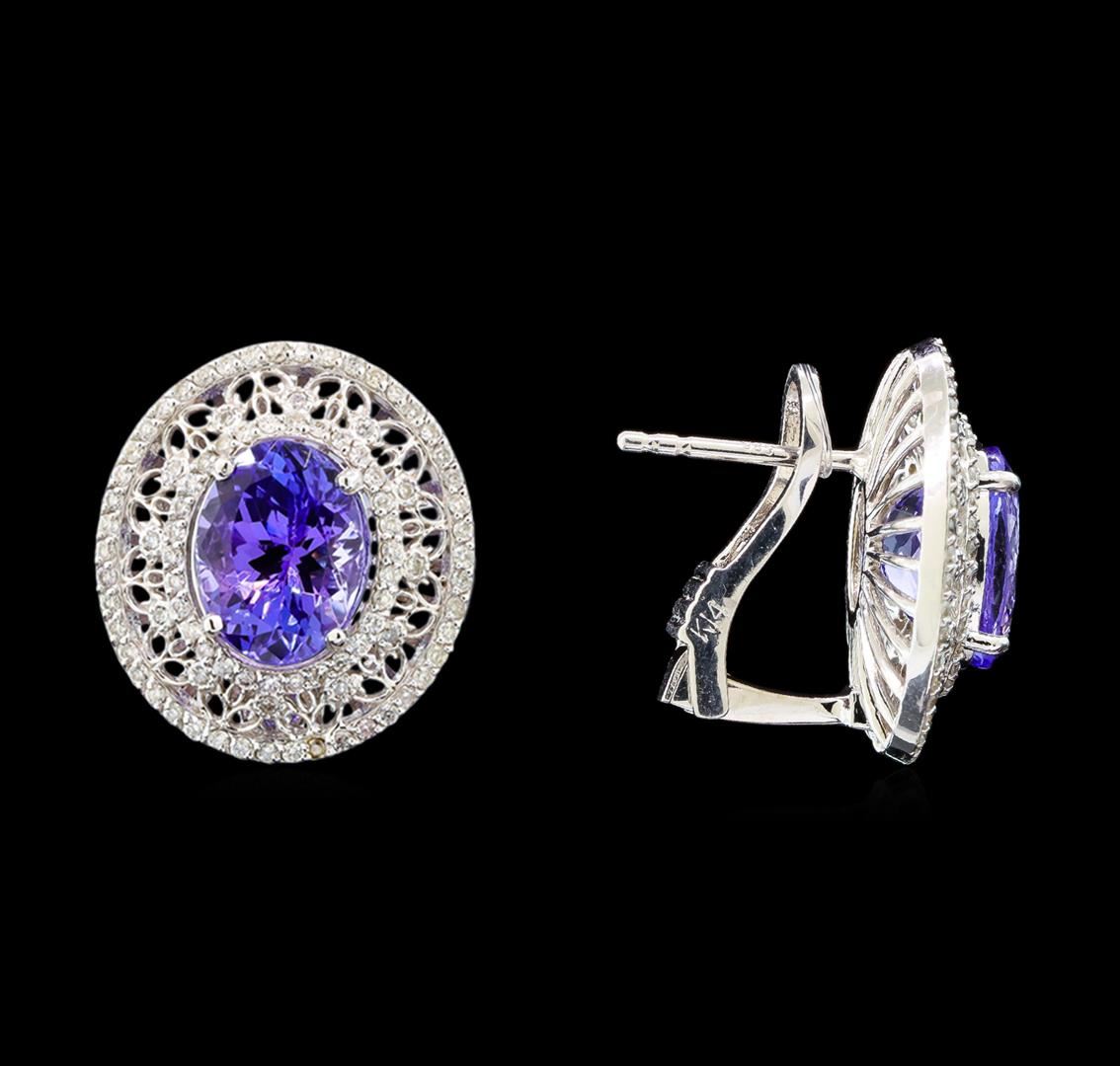 One suite electronically tested 14KT white gold ladies cast tanzanite and diamond earrings with Omega clip backs with a bright polish finish. Identified with markings of "14K". Condition is new. Containing: Two prong set oval modified brilliant cut natural tanzanites, measuring 10.00 x 7.70 x 5.01mm, approximate total weight of 5.42ct., clarity is eye clean, type I, medium light, moderately strong, violet color, (GIA V 4/4), cut is good. One Hundred Seventy-Six prong set round brilliant cut diamonds, measuring 1.00 - 1.00 x 0.60mm (depth est.) approximate total weight of 176 Stones = 0.63ct. Clarity: I-1 to I-2. Color: H - I. Colored gemstones are presumed to have been subjected to commonly used enhancement processes. All diamonds and colored gemstones are graded in the mounting, unless otherwise stated. Total Weight of Colored Stones 5.42ct. Total Weight of Diamonds 0.63ct. Total Weight of Earrings 8.30 grams. GGL Appraised at $5,470.00.