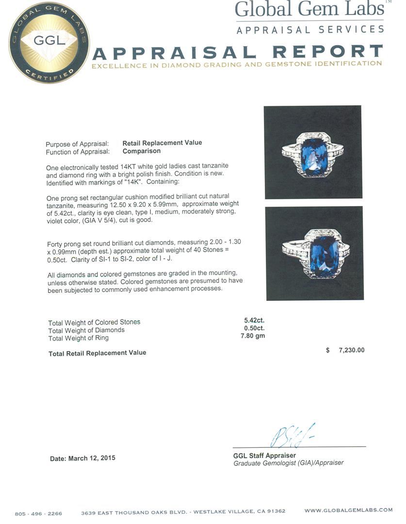 One electronically tested 14KT white gold ladies cast tanzanite and diamond ring with a bright polish finish. Identified with markings of "14K". Condition is new. Containing: One prong set rectangular cushion modified brilliant cut natural tanzanite, measuring 12.50 x 9.20 x 5.99mm, approximate weight of 5.42ct., clarity is eye clean, type I, medium, moderately strong, violet color, (GIA V 5/4), cut is good. Forty prong set round brilliant cut diamonds, measuring 2.00. - 1.30 x 0.99mm (depth est.) approximate total weight of 40 Stones = 0.50ct. Clarity: SI-1 to SI-2. Color: I - J. All diamonds and colored gemstones are graded in the mounting, unless otherwise stated. Colored gemstones are presumed to have been subjected to commonly used enhancement processes. Total Weight of Colored Stones 5.42ct. Total Weight of Diamonds 0.50ct. Total Weight of Ring 7.80 grams. GGL Appraised at $7,230.00.