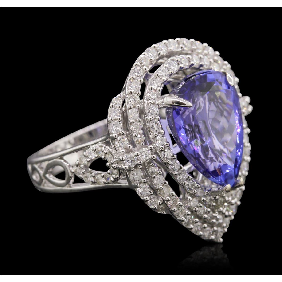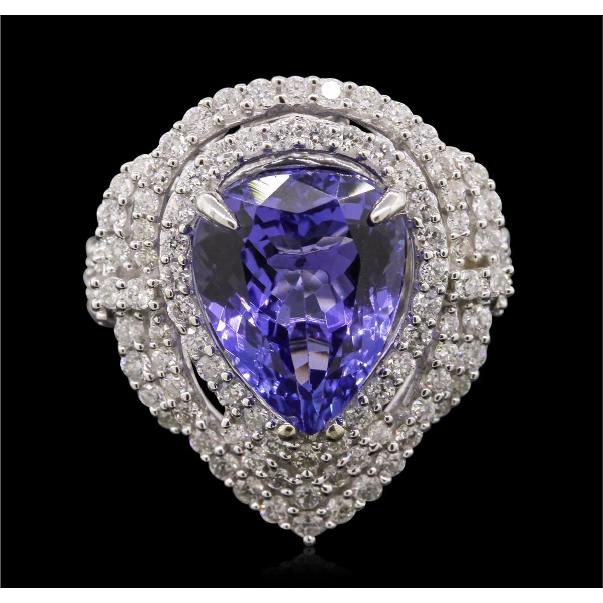 One electronically tested 14KT white gold Ladies cast ring with a bright polish finish. Condition is new. Identified with markings of "14K". Containing: One prong set pear modified brilliant cut natural tanzanite, measuring 12.84 x 9.85 x 6.40mm, approximate weight of 5.42ct., clarity is eye clean, type I, medium, moderately strong, bluish violet color, (GIA bV 5/4), cut is very good. Colored gemstones are presumed to have been subjected to commonly used color/clarity enhancement processes. Eighty prong set round brilliant cut diamonds, measuring 1.30 - 1.30 x 0.78mm (depth est.) approximate. Total Weight of 80 Stones = 0.64ct. Clarity: I-1 to I-2. Color: I - J, Cut is Good. Total Weight of Colored Stones 5.42ct. Total Weight of Diamonds 0.64ct. Total Weight of Ring 6.60 Grams. GGL Appraised at $10,530.00.