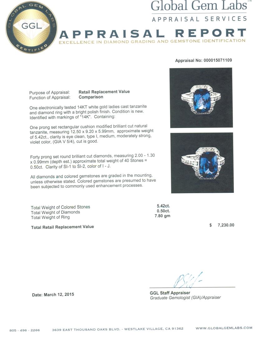 One electronically tested 14KT white gold ladies cast tanzanite and diamond ring with a bright polish finish. Identified with markings of "14K". Condition is new. Containing: One prong set rectangular cushion modified brilliant cut natural tanzanite, measuring 12.50 x 9.20 x 5.99mm, approximate weight of 5.42ct., clarity is eye clean, type I, medium, moderately strong, violet color, (GIA V 5/4), cut is good. Forty prong set round brilliant cut diamonds, measuring 2.00. - 1.30 x 0.99mm (depth est.) approximate total weight of 40 Stones = 0.50ct. Clarity: SI-1 to SI-2. Color: I - J. All diamonds and colored gemstones are graded in the mounting, unless otherwise stated. Colored gemstones are presumed to have been subjected to commonly used enhancement processes. Total Weight of Colored Stones 5.42ct. Total Weight of Diamonds 0.50ct. Total Weight of Ring 7.80 grams. GGL Appraised at $7,230.00.