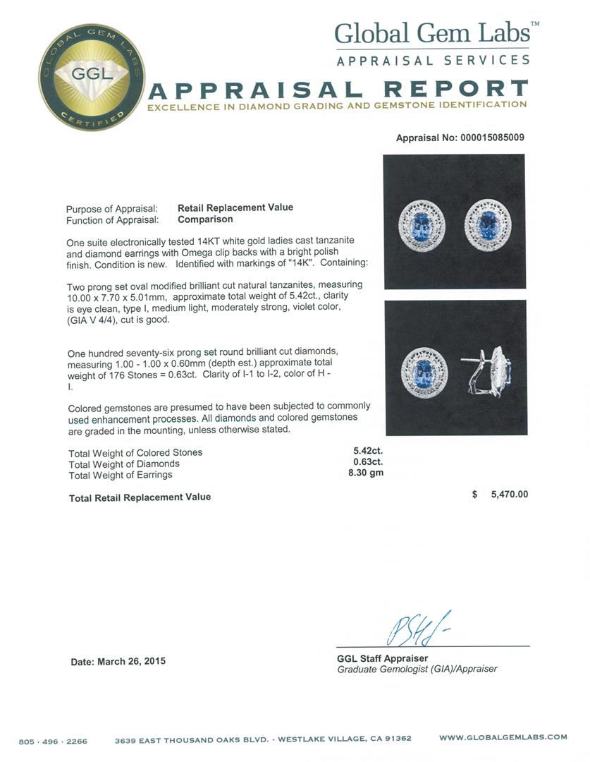 One suite electronically tested 14KT white gold ladies cast tanzanite and diamond earrings with Omega clip backs with a bright polish finish. Identified with markings of "14K". Condition is new. Containing: Two prong set oval modified brilliant cut natural tanzanites, measuring 10.00 x 7.70 x 5.01mm, approximate total weight of 5.42ct., clarity is eye clean, type I, medium light, moderately strong, violet color, (GIA V 4/4), cut is good. One Hundred Seventy-Six prong set round brilliant cut diamonds, measuring 1.00 - 1.00 x 0.60mm (depth est.) approximate total weight of 176 Stones = 0.63ct. Clarity: I-1 to I-2. Color: H - I. Colored gemstones are presumed to have been subjected to commonly used enhancement processes. All diamonds and colored gemstones are graded in the mounting, unless otherwise stated. Total Weight of Colored Stones 5.42ct. Total Weight of Diamonds 0.63ct. Total Weight of Earrings 8.30 grams. GGL Appraised at $5,470.00.