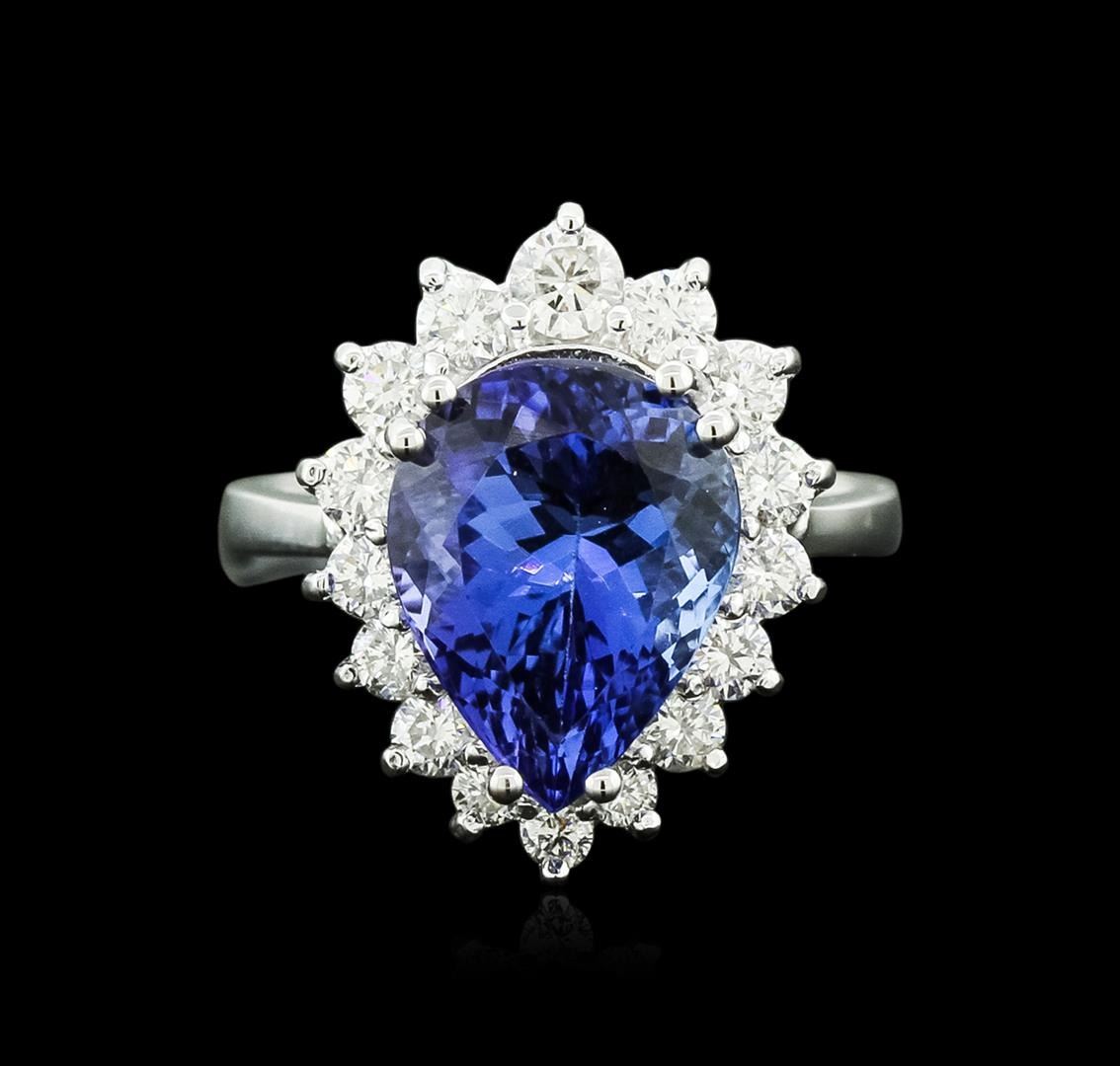 One electronically tested 14KT white gold ladies cast tanzanite and diamond ring with a bright and brushed finish. Identified with markings of "14K". Condition is new. Containing: One prong set pear modified brilliant cut natural tanzanite, measuring 12.50 x 9.00. x 7.20mm, approximate weight of 5.43ct., clarity is eye clean, type I, medium, very slightly grayish, bluish violet color, (GIA bV 5/3), cut is good. Sixteen prong set round brilliant cut diamonds, measuring 3.00. - 2.50 x 1.65mm (depth est.) approximate total weight of 16 Stones = 1.00.ct. Clarity: SI-1. Color: I - J. Colored gemstones are presumed to have been subjected to commonly used enhancement processes. All diamonds and colored gemstones are graded in the mounting, unless otherwise stated. Total Weight of Colored Stones 5.43ct. Total Weight of Diamonds 1.00.ct. Total Weight of Ring 6.30 grams. GGL Appraised at $7,050.00.