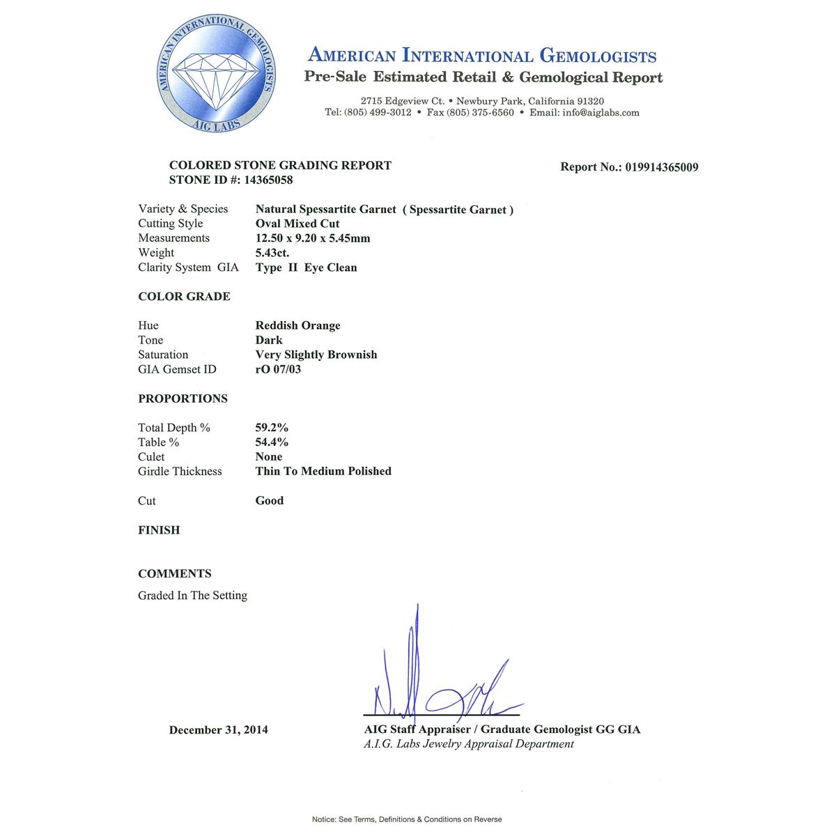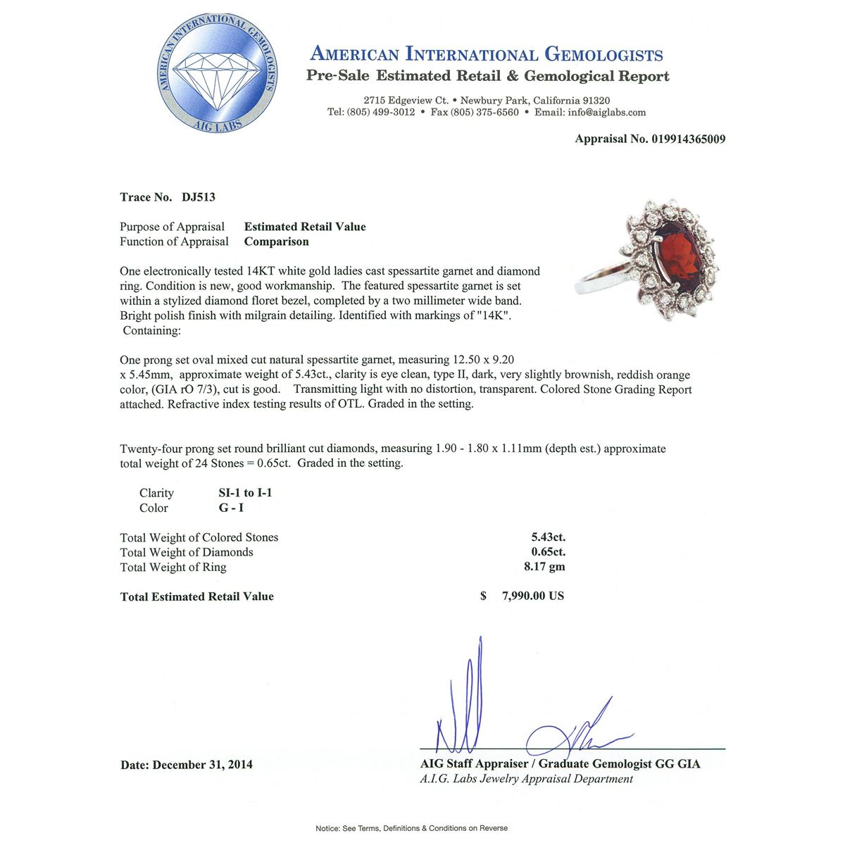 One electronically tested 14KT white gold ladies cast spessartite garnet and diamond ring. The featured spessartite garnet is set within a stylized diamond floret bezel, completed by a two millimeter wide band. Bright polish finish with milgrain detailing. Identified with markings of "14K". Condition is new, good workmanship. Containing: One prong set oval mixed cut natural spessartite garnet, measuring 12.50 x 9.20 x 5.45mm, approximate weight of 5.43ct., clarity is eye clean, type II, dark, very slightly brownish, reddish orange color, (GIA rO 7/3), cut is good. Transmitting light with no distortion, transparent. Colored Stone Grading Report attached. Refractive index testing results of OTL. Graded in the setting. Twenty-Four prong set round brilliant cut diamonds, measuring 1.90 - 1.80 x 1.11mm (depth est.) approximate total weight of 24 Stones = 0.65ct. Graded in the setting. Clarity: SI-1 to I-1. Color: G - I. Total Weight of Colored Stones 5.43ct. Total Weight of Diamonds 0.65ct. Total Weight of Ring 8.17 grams. AIG Appraised at $7,990.00.
