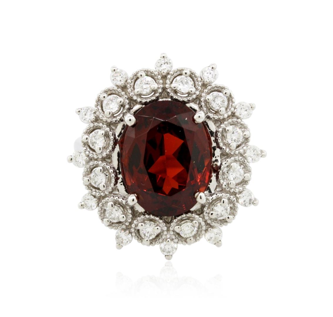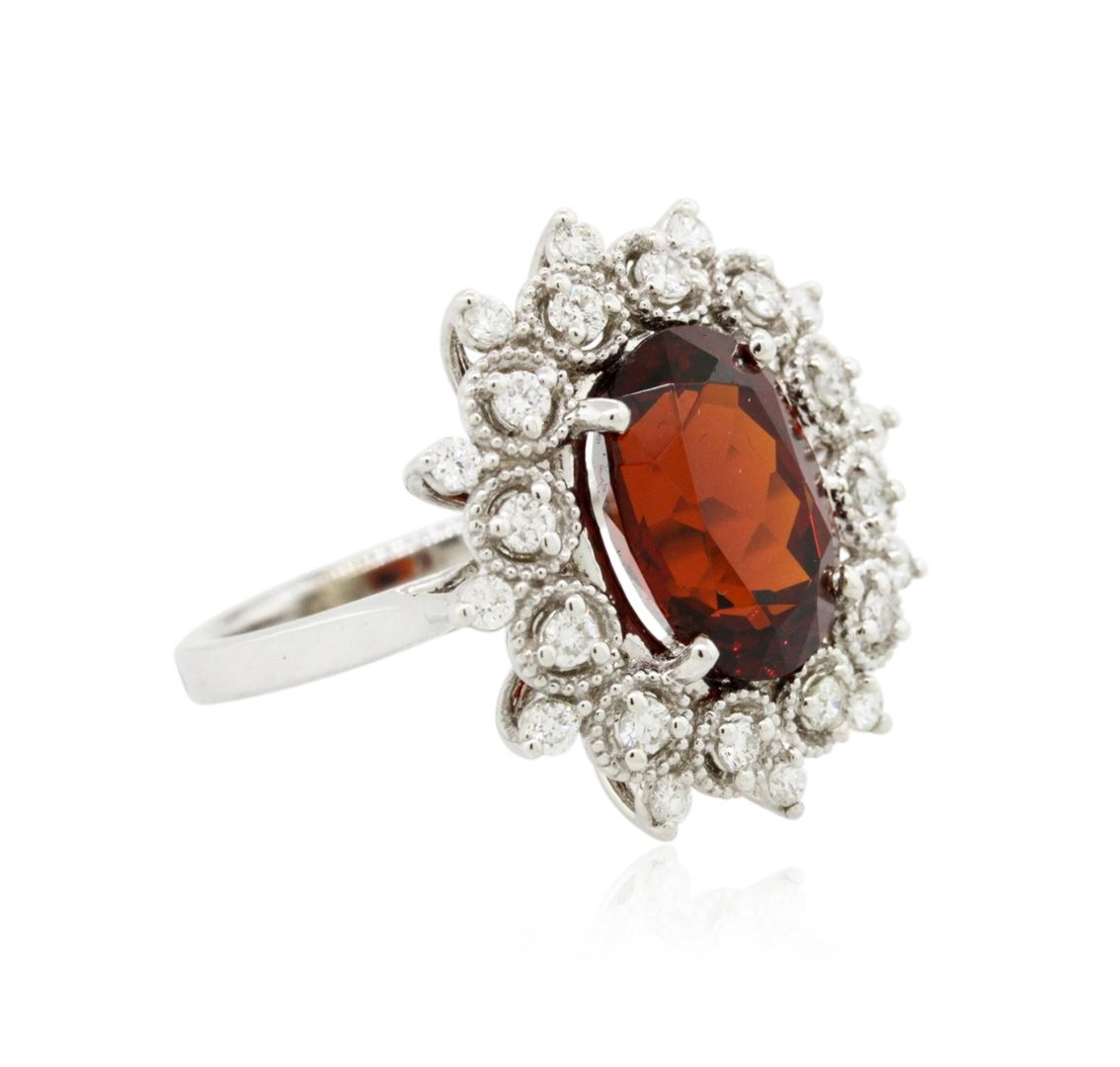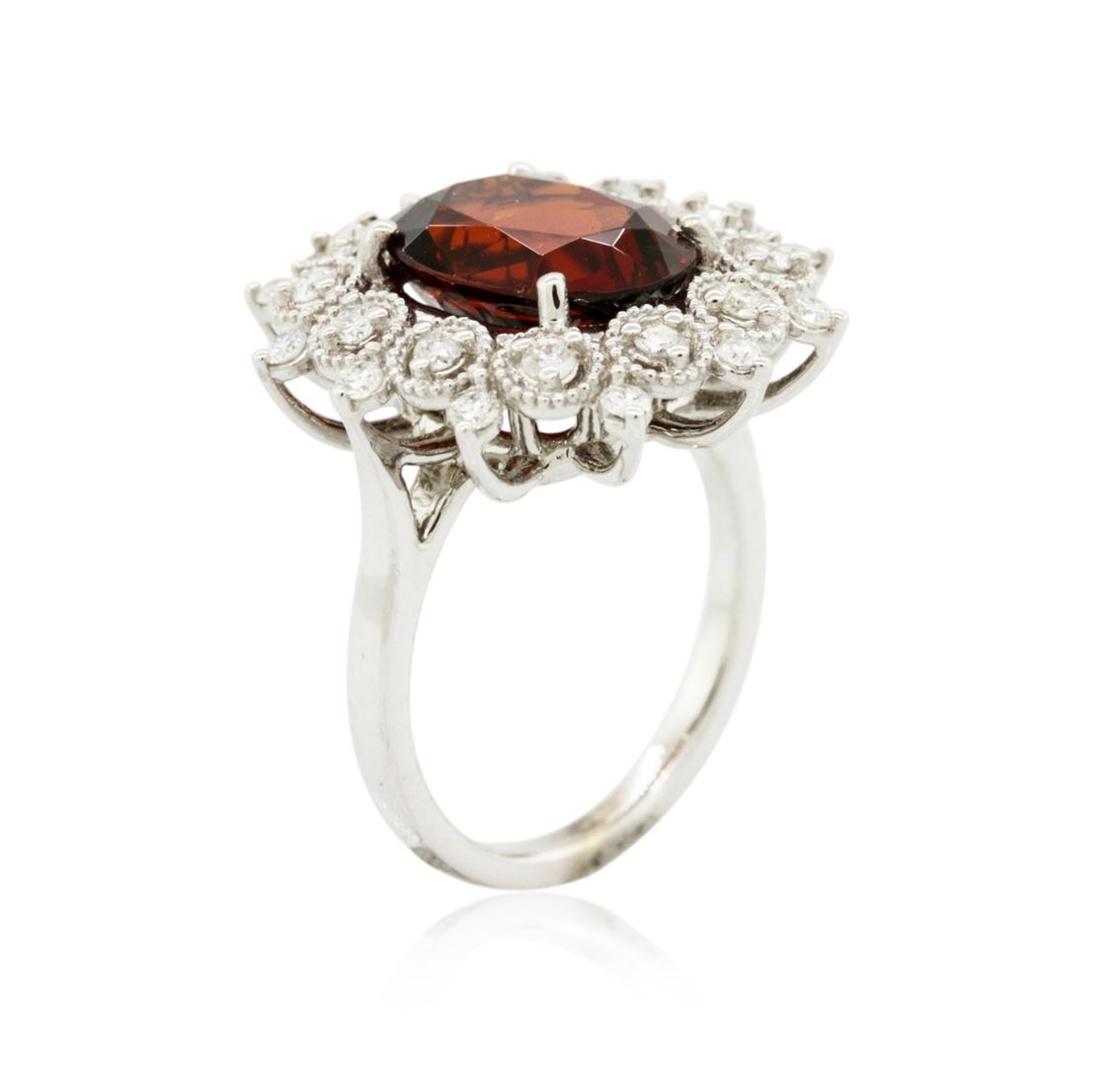 One electronically tested 14KT white gold ladies cast spessartite garnet and diamond ring. The featured spessartite garnet is set within a stylized diamond floret bezel, completed by a two millimeter wide band. Bright polish finish with milgrain detailing. Identified with markings of "14K". Condition is new, good workmanship. Containing: One prong set oval mixed cut natural spessartite garnet, measuring 12.50 x 9.20 x 5.45mm, approximate weight of 5.43ct., clarity is eye clean, type II, dark, very slightly brownish, reddish orange color, (GIA rO 7/3), cut is good. Transmitting light with no distortion, transparent. Colored Stone Grading Report attached. Refractive index testing results of OTL. Graded in the setting. Twenty-Four prong set round brilliant cut diamonds, measuring 1.90 - 1.80 x 1.11mm (depth est.) approximate total weight of 24 Stones = 0.65ct. Graded in the setting. Clarity: SI-1 to I-1. Color: G - I. Total Weight of Colored Stones 5.43ct. Total Weight of Diamonds 0.65ct. Total Weight of Ring 8.17 grams. AIG Appraised at $7,990.00.