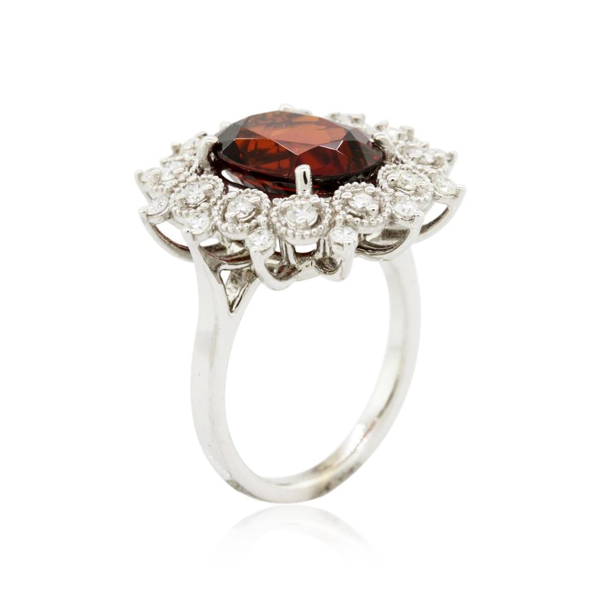 One electronically tested 14KT white gold ladies cast spessartite garnet and diamond ring. The featured spessartite garnet is set within a stylized diamond floret bezel, completed by a two millimeter wide band. Bright polish finish with milgrain detailing. Identified with markings of "14K". Condition is new, good workmanship. Containing: One prong set oval mixed cut natural spessartite garnet, measuring 12.50 x 9.20 x 5.45mm, approximate weight of 5.43ct., clarity is eye clean, type II, dark, very slightly brownish, reddish orange color, (GIA rO 7/3), cut is good. Transmitting light with no distortion, transparent. Colored Stone Grading Report attached. Refractive index testing results of OTL. Graded in the setting. Twenty-Four prong set round brilliant cut diamonds, measuring 1.90 - 1.80 x 1.11mm (depth est.) approximate total weight of 24 Stones = 0.65ct. Graded in the setting. Clarity: SI-1 to I-1. Color: G - I. Total Weight of Colored Stones 5.43ct. Total Weight of Diamonds 0.65ct. Total Weight of Ring 8.17 grams. AIG Appraised at $7,990.00.