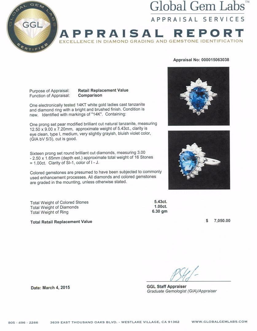 One electronically tested 14KT white gold ladies cast tanzanite and diamond ring with a bright and brushed finish. Identified with markings of "14K". Condition is new. Containing: One prong set pear modified brilliant cut natural tanzanite, measuring 12.50 x 9.00. x 7.20mm, approximate weight of 5.43ct., clarity is eye clean, type I, medium, very slightly grayish, bluish violet color, (GIA bV 5/3), cut is good. Sixteen prong set round brilliant cut diamonds, measuring 3.00. - 2.50 x 1.65mm (depth est.) approximate total weight of 16 Stones = 1.00.ct. Clarity: SI-1. Color: I - J. Colored gemstones are presumed to have been subjected to commonly used enhancement processes. All diamonds and colored gemstones are graded in the mounting, unless otherwise stated. Total Weight of Colored Stones 5.43ct. Total Weight of Diamonds 1.00.ct. Total Weight of Ring 6.30 grams. GGL Appraised at $7,050.00.